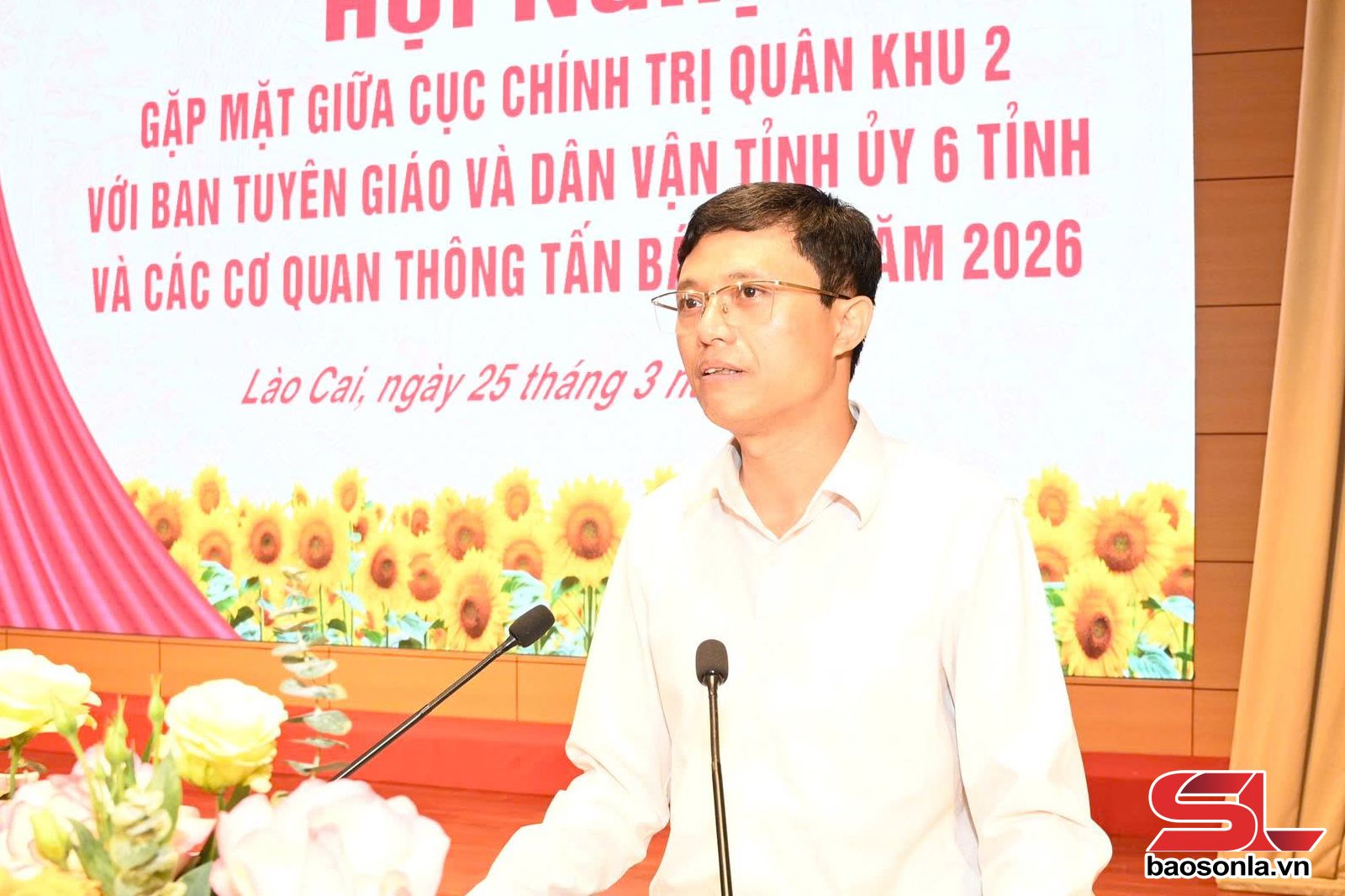 Ngày 25/3, tại tỉnh Lào Cai, Cục Chính trị Quân khu 2 phối hợp với Ban Tuyên giáo và Dân vận Tỉnh ủy Lào Cai tổ chức Hội nghị gặp mặt giữa Cục Chính trị Quân khu với Ban Tuyên giáo và Dân vận Tỉnh ủy 6 tỉnh trên địa bàn và các cơ quan thông tấn, báo chí năm 2026. Dự và chỉ đạo hội nghị có Thiếu tướng Nguyễn Hồng Thái, Ủy viên Ban Thường vụ Đảng ủy, Phó Chính ủy Quân khu 2; đồng chí Hoàng Giang, Phó Bí thư Thường trực Tỉnh ủy Lào Cai.