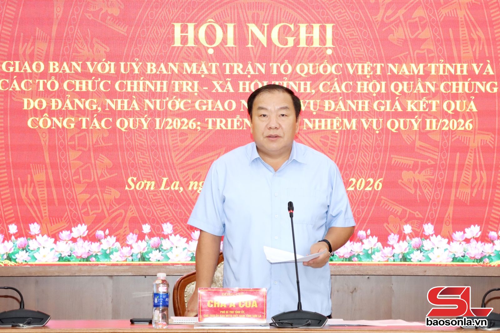 Ngày 1/4, đồng chí Chá A Của, Phó Bí thư Tỉnh ủy, Chủ tịch Ủy ban MTTQ Việt Nam tỉnh, đã chủ trì Hội nghị giao ban với Ủy ban MTTQ Việt Nam tỉnh và các tổ chức chính trị - xã hội, các hội quần chúng do Đảng, Nhà nước giao nhiệm vụ, đánh giá kết quả công tác quý I/2026; triển khai nhiệm vụ quý II/2026.