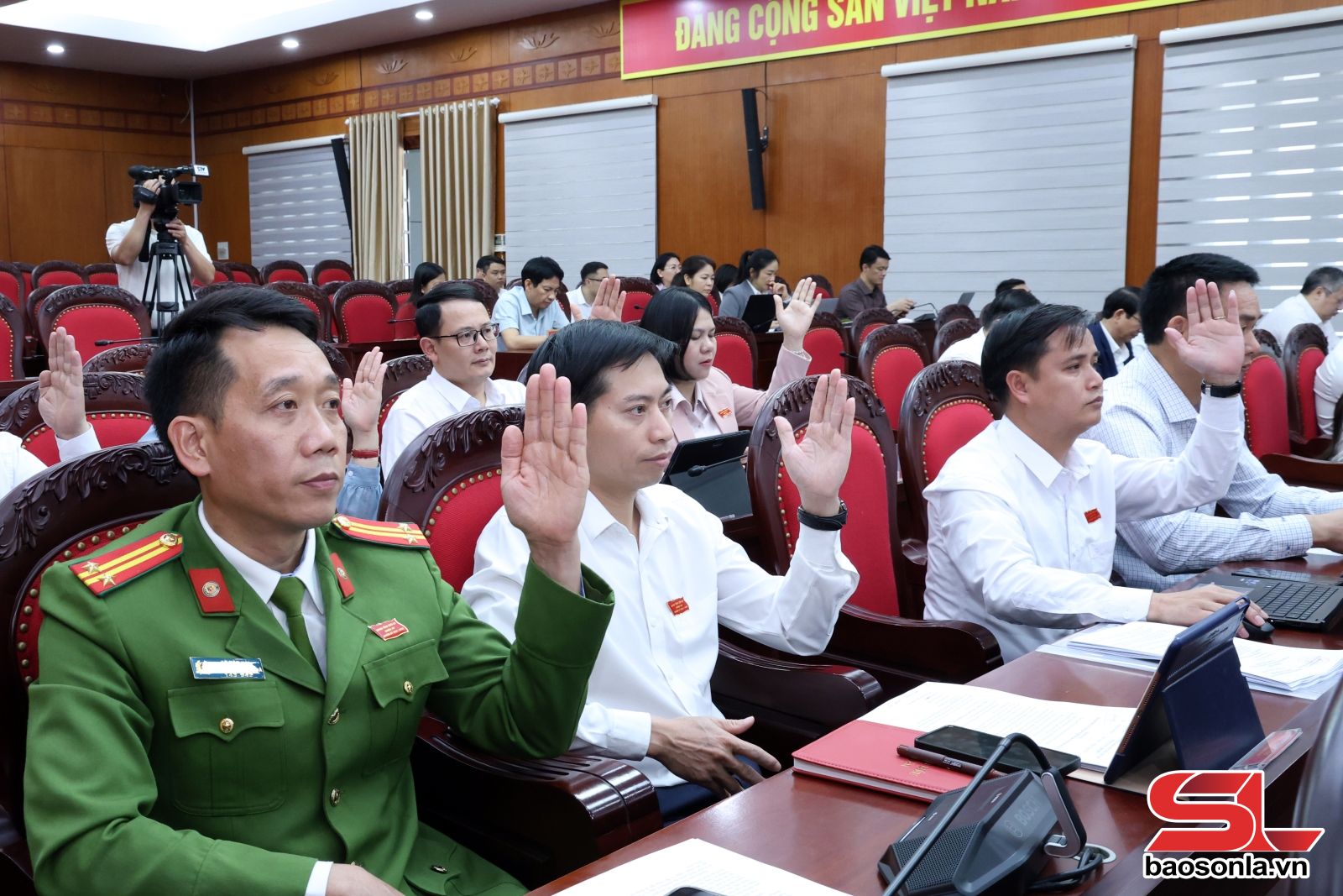 Tại kỳ họp, HĐND tỉnh đã biểu quyết thông qua 8 dự thảo Nghị quyết quan trọng, gồm: Thông qua nội dung điều chỉnh Quy hoạch tỉnh thời kỳ 2021 - 2030, tầm nhìn đến năm 2050; điều chỉnh kế hoạch đầu tư công trung hạn giai đoạn 2021 - 2025 nguồn vốn ngân sách Trung ương thực hiện các chương trình mục tiêu quốc gia; quy định cơ chế, chính sách tín dụng ưu đãi qua Chi nhánh Ngân hàng Chính sách xã hội tỉnh giai đoạn 2026 - 2030; thông qua danh mục các công trình, dự án Nhà nước thu hồi đất để thực hiện các dự án phát triển kinh tế – xã hội vì lợi ích quốc gia, công cộng trên địa bàn tỉnh; điều chỉnh diện tích thu hồi đất và thông tin các dự án đã được HĐND tỉnh thông qua; phê duyệt chủ trương chuyển mục đích sử dụng rừng để thực hiện 2 dự án di chuyển đường dây 110kV Mộc Châu - Mai Châu, Hòa Bình và dự án Trường Nội trú liên cấp Tiểu học - THCS Mường Lạn; quy định mức chi tổ chức giải thi đấu thể thao trên địa bàn tỉnh; quy định mức học phí đối với giáo dục mầm non và phổ thông công lập, cùng mức hỗ trợ học phí đối với trẻ em mầm non, học sinh, người học tại các cơ sở giáo dục dân lập, tư thục từ năm học 2025 - 2026.