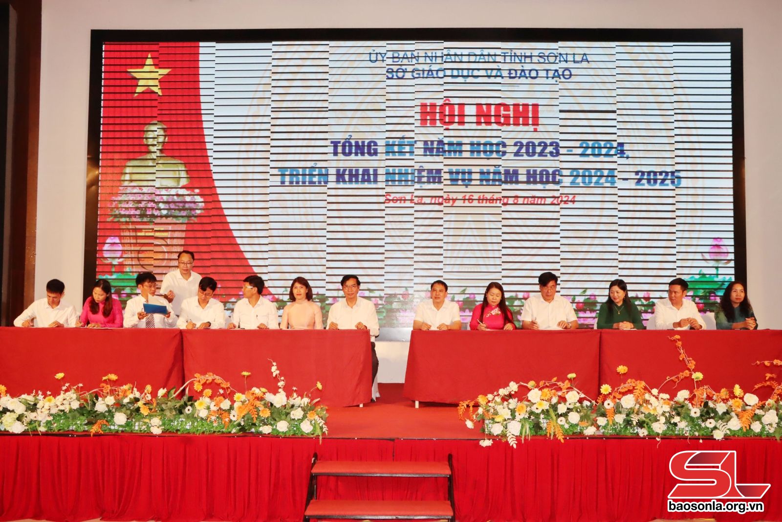 Tại Hội nghị, đã ký cam kết và giao ước thi đua giữa Giám đốc Sở GD&ĐT với lãnh đạo 12 huyện, thành phố; các phòng GD&ĐT các huyện, thành phố, các trường học trực thuộc về nội dung thực hiện đúng các khoản thu trong các cơ sở giáo dục; về chất lượng giáo dục năm học 2024-2025 và kết quả, phổ điểm, chỉ tiêu tỷ lệ tốt nghiệp kỳ thi tốt nghiệp THPT năm 2025 theo chương trình giáo dục phổ thông 2018.