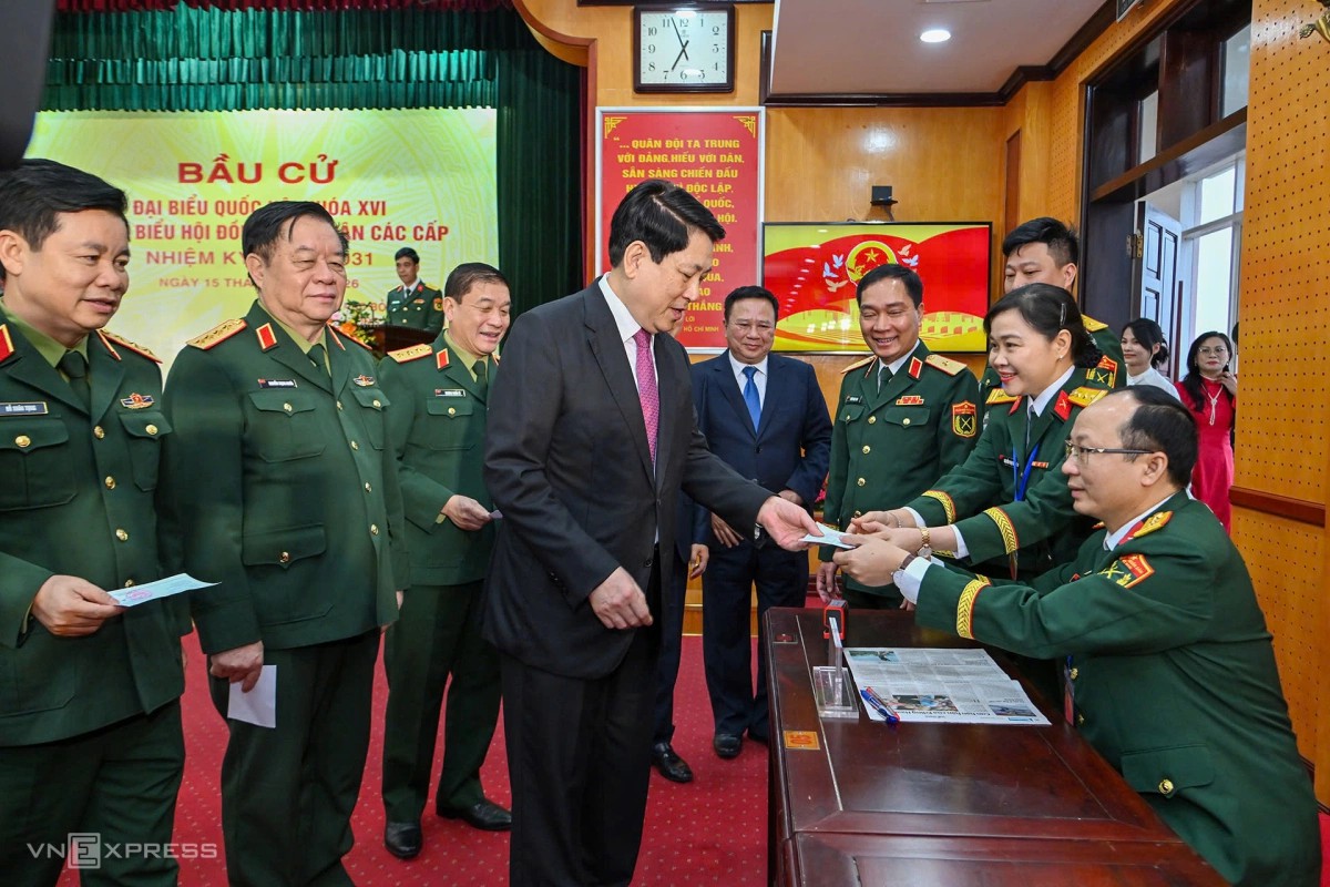 Chủ tịch nước Lương Cường và đại tướng Nguyễn Trọng Nghĩa, Chủ nhiệm Tổng cục Chính trị Quân đội nhân dân Việt Nam dự lễ chào cờ và tham gia bỏ phiếu tại khu vực bỏ phiếu số 26, phường Hoàn Kiếm, thành phố Hà Nội. Ảnh: Phạm Hải