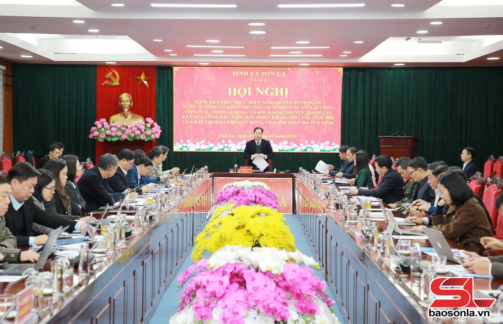 Ngày 7/1, Ban Thường vụ Tỉnh ủy Sơn La tổ chức Hội nghị trực tuyến tổng kết việc thực hiện Nghị quyết số 18-NQ/TU ngày 11/11/2021 về tăng cường lãnh đạo, chỉ đạo công tác phòng chống và kiểm soát ma túy giai đoạn 2021 - 2025; đánh giá kết quả công tác năm 2025, triển khai nhiệm vụ năm 2026 của Ban Chỉ đạo phòng, chống và kiểm soát ma túy tỉnh.