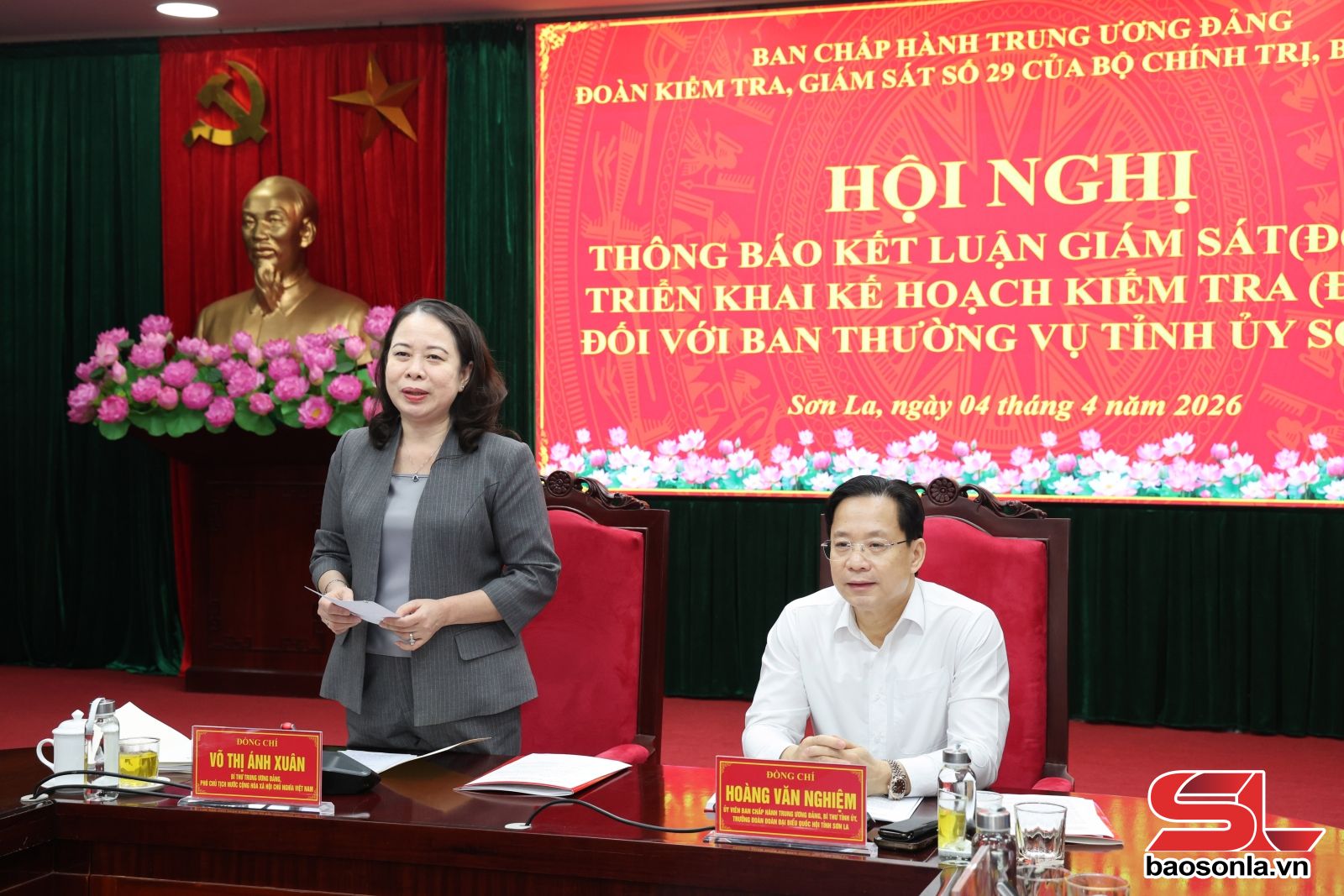Sau khi nghe thông báo kết luận về kết quả giám sát đợt 1 và ý kiến trao đổi của các thành viên trong Ban Thường vụ Tỉnh ủy Sơn La và thành viên Đoàn, Phó Chủ tịch nước Võ Thị Ánh Xuân ghi nhận, đánh giá cao Ban Thường vụ Tỉnh ủy Sơn La đã kịp thời lãnh đạo, chỉ đạo quán triệt và triển khai Nghị quyết Đại hội XIV, Chỉ thị số 01-CT/TW ngày 23/1/2026 của Bộ Chính trị về nghiên cứu, học tập, quán triệt, tuyên truyền và triển khai thực hiện Nghị quyết Đại hội đại biểu toàn quốc lần thứ XIV của Đảng nghiêm túc, đúng với tinh thần chỉ đạo của Trung ương. Tỉnh đã kịp thời ban hành kế hoạch, tổ chức học tập, quán triệt từ tỉnh đến cơ sở tới 100% đảng ủy trực thuộc, tỷ lệ đảng viên được học tập đạt 99,88%; cụ thể hóa các nghị quyết bằng chương trình hành động rõ mục tiêu với các nhiệm vụ trọng tâm gắn với trách nhiệm, tiến độ, nguồn lực.