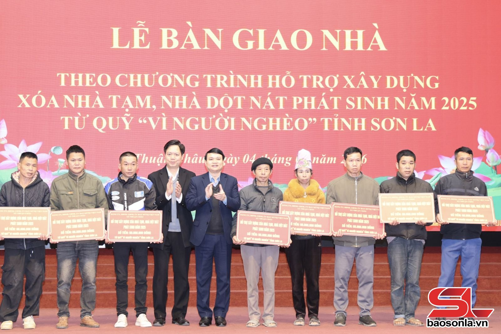 Tại buổi lễ, lãnh đạo tỉnh và các sở, ngành đã trao biển tượng trưng kinh phí hỗ trợ nhà ở cho các hộ nghèo, cận nghèo trên địa bàn xã Thuận Châu.