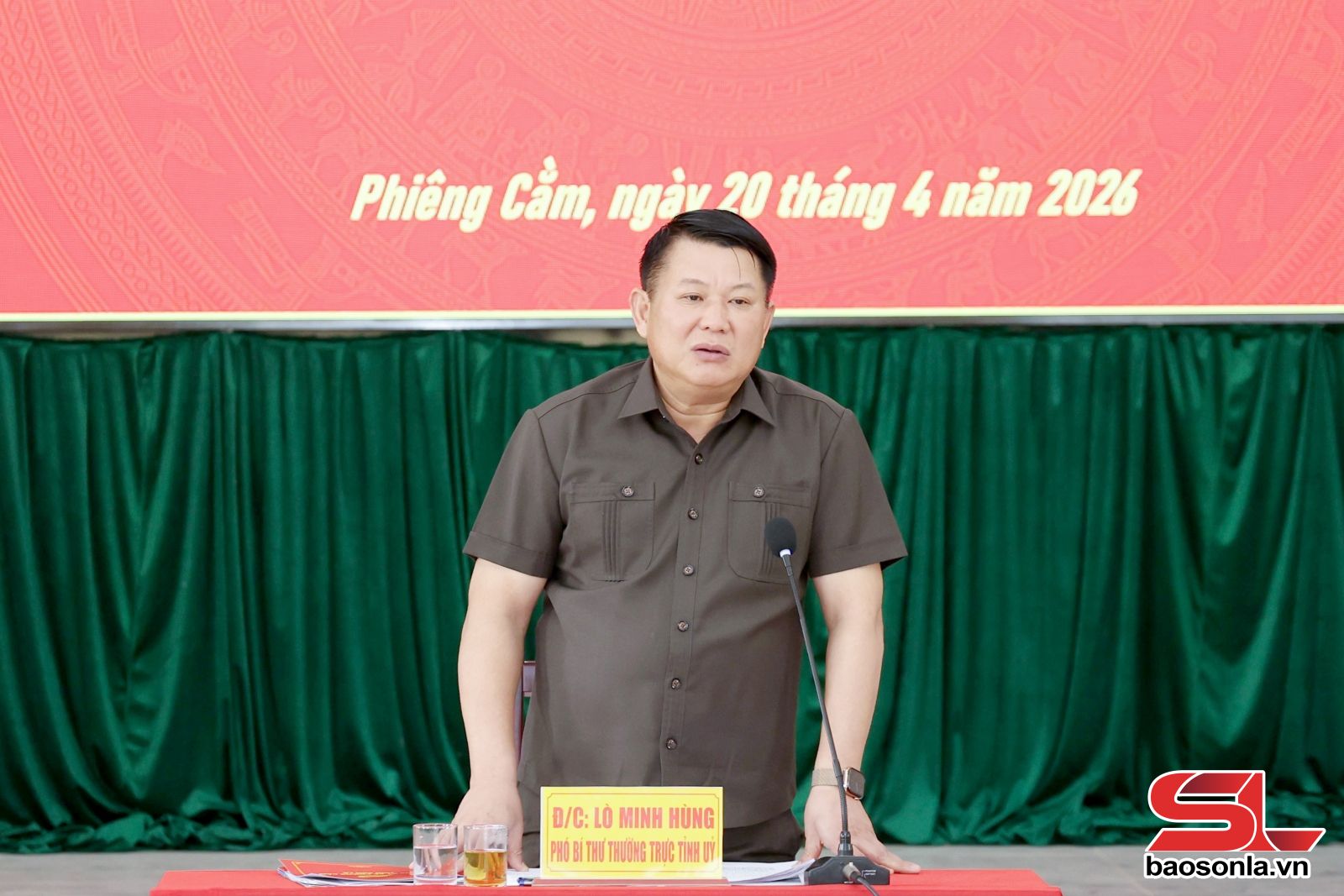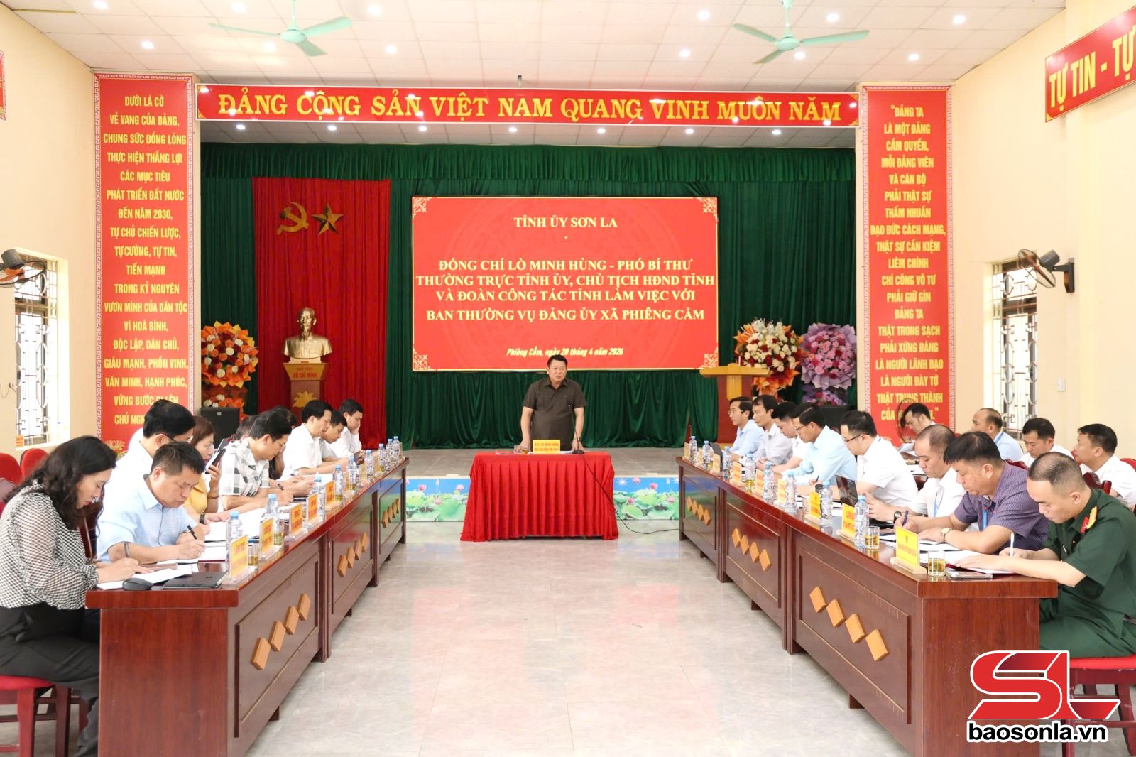 Phát biểu tại cuộc làm việc, đồng chí Lò Minh Hùng ghi nhận và đánh giá cao nỗ lực của xã Phiêng Cằm trong việc nhanh chóng ổn định tổ chức và vận hành hiệu quả mô hình chính quyền mới. Về nhiệm vụ thời gian tới, đồng chí giao Ban Thường vụ Đảng ủy xã Phiêng Cằm tiếp tục quán triệt, triển khai thực hiện tốt Nghị quyết Đại hội Đảng các cấp; tăng cường công tác xây dựng, chỉnh đốn Đảng và củng cố hệ thống chính trị trong sạch, vững mạnh; nâng cao năng lực lãnh đạo, sức chiến đấu của tổ chức đảng và đảng viên. Quan tâm làm tốt công tác quy hoạch, đào tạo đội ngũ cán bộ, công chức và phát triển đảng viên mới, nhất là trong các đơn vị sự nghiệp, doanh nghiệp, hợp tác xã. Đẩy mạnh chuyển đổi số theo Nghị quyết số 57-NQ/TW. Thực hiện hiệu quả công tác tôn giáo, dân vận và bảo vệ nền tảng tư tưởng của Đảng; thực hiện tốt chủ trương sáp nhập bản, tiểu khu, tổ dân phố; nâng cao chất lượng, hiệu quả hoạt động của hệ thống chính trị theo mô hình chính quyền hai cấp...