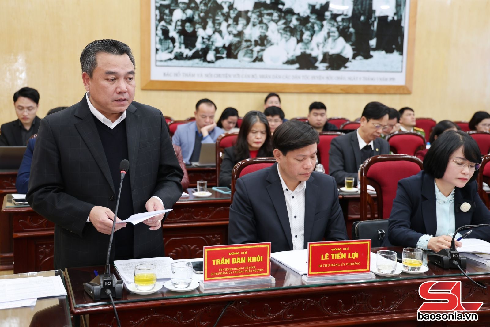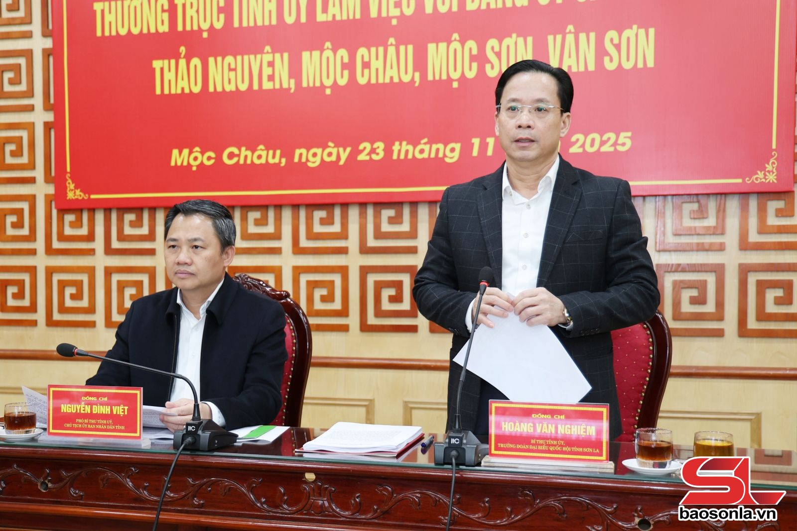 Dự và chủ trì cuộc làm việc có các đồng chí: Hoàng Văn Nghiệm, Bí thư Tỉnh ủy, Trưởng Đoàn đại biểu Quốc hội tỉnh; Nguyễn Đình Việt, Phó Bí thư Tỉnh ủy, Chủ tịch UBND tỉnh; các đồng chí Ủy viên Ban Thường vụ Tỉnh ủy, Thường trực UBND tỉnh; lãnh đạo các sở, ngành của tỉnh; tập thể Thường trực Đảng ủy các phường: Thảo Nguyên, Mộc Châu, Mộc Sơn, Vân Sơn.