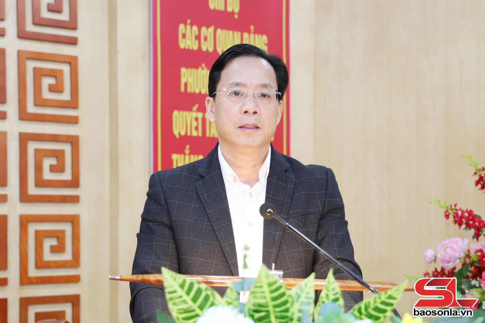 Phát biểu tại cuộc làm việc, đồng chí Bí thư Tỉnh ủy ghi nhận những nỗ lực, cố gắng của cấp ủy, chính quyền các phường trong thực hiện các nhiệm vụ trên các lĩnh vực thời gian qua. Đồng thời, đề nghị cấp ủy, chính quyền các phường tiếp tục phát huy những kết quả đạt được, khắc phục những khó khăn, lãnh đạo, chỉ đạo thực hiện hiệu quả nghị quyết đại hội đảng các cấp. Trọng tâm là tập trung phát triển nông nghiệp ứng dụng công nghệ cao, nông nghiệp hữu cơ; nâng cao chất lượng sản phẩm nông sản hàng hóa chủ lực theo chuỗi giá trị gắn với xây dựng, phát triển và bảo vệ thương hiệu; phối hợp xây dựng Khu nông nghiệp ứng dụng công nghệ cao Sơn La; thực hiện việc di dời các cơ sở chăn nuôi ra khỏi khu vực dân cư theo quy định. Tăng cường lãnh đạo, chỉ đạo thực hiện tốt công tác quản lý đất đai, trật tự đô thị, quy hoạch đô thị; tập trung cao cho công tác giải phóng mặt bằng, làm cơ sở để đẩy nhanh tiến độ triển khai thực hiện các dự án trọng điểm trên địa bàn, nhất là các dự án phát triển cơ sở hạ tầng giao thông, đô thị, các dự án hạ tầng Khu du lịch Quốc gia Mộc Châu. Phát triển du lịch theo hướng chuyên nghiệp, có thương hiệu, có trọng tâm, trọng điểm trên cơ sở khai thác hiệu quả tiềm năng của các phường gắn với ứng dụng công nghệ số.