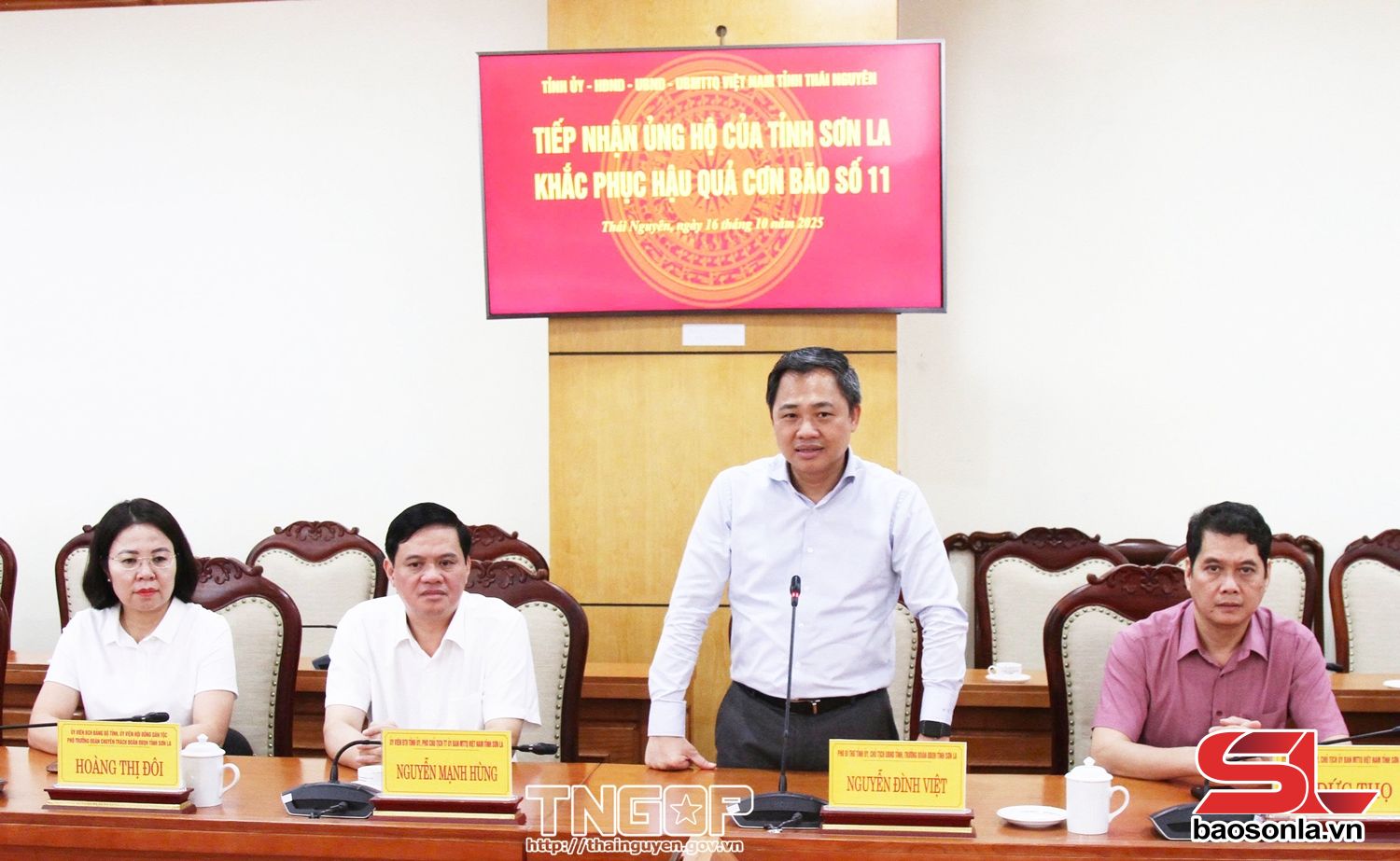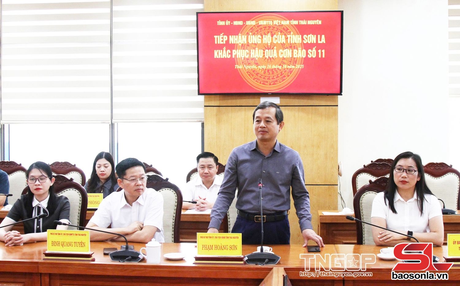 Sáng 16/10, Đoàn công tác của tỉnh Sơn La do đồng chí Nguyễn Đình Việt, Phó Bí thư Tỉnh ủy, Chủ tịch UBND tỉnh, Trưởng đoàn ĐBQH làm Trưởng Đoàn đã đến thăm, động viên và trao tặng 1 tỷ đồng hỗ trợ Nhân dân tỉnh Thái Nguyên khắc phục hậu quả bão số 11 và hoàn lưu bão. Tiếp Đoàn có đồng chí Phạm Hoàng Sơn, Phó Bí thư Tỉnh ủy, Chủ tịch UBND tỉnh; đồng chí Đinh Quang Tuyên, Phó Bí thư Tỉnh ủy, Chủ tịch Ủy ban MTTQ tỉnh.