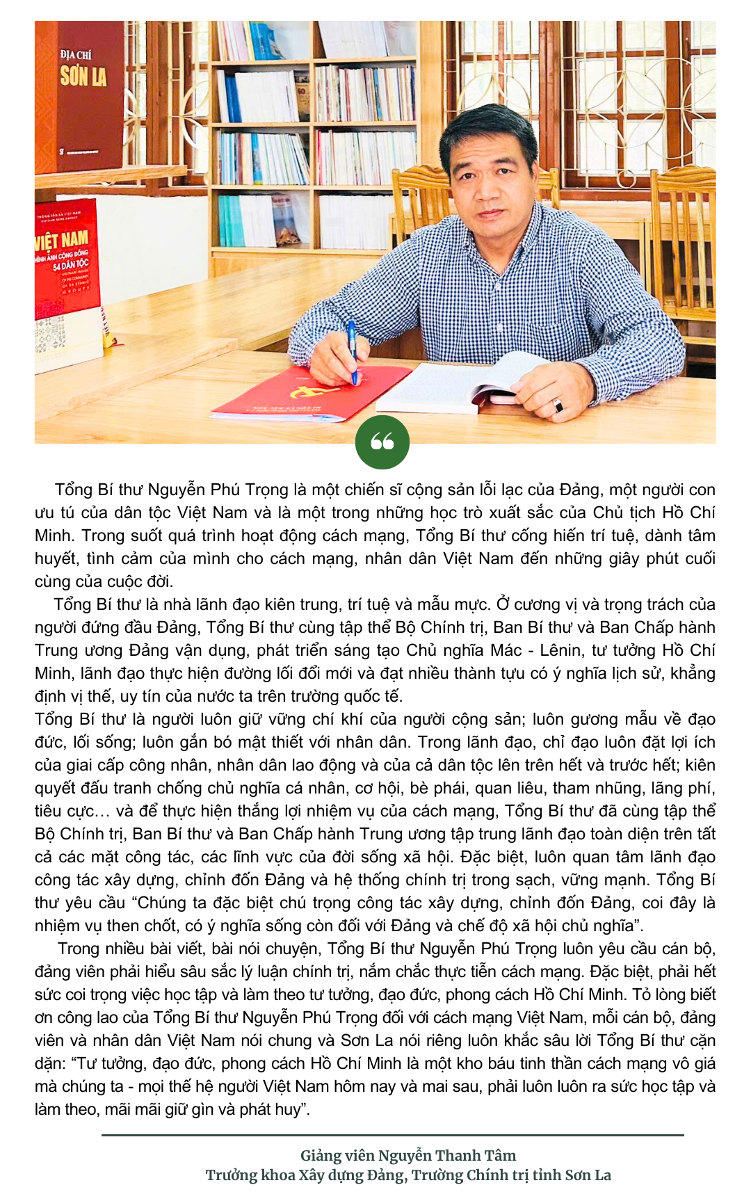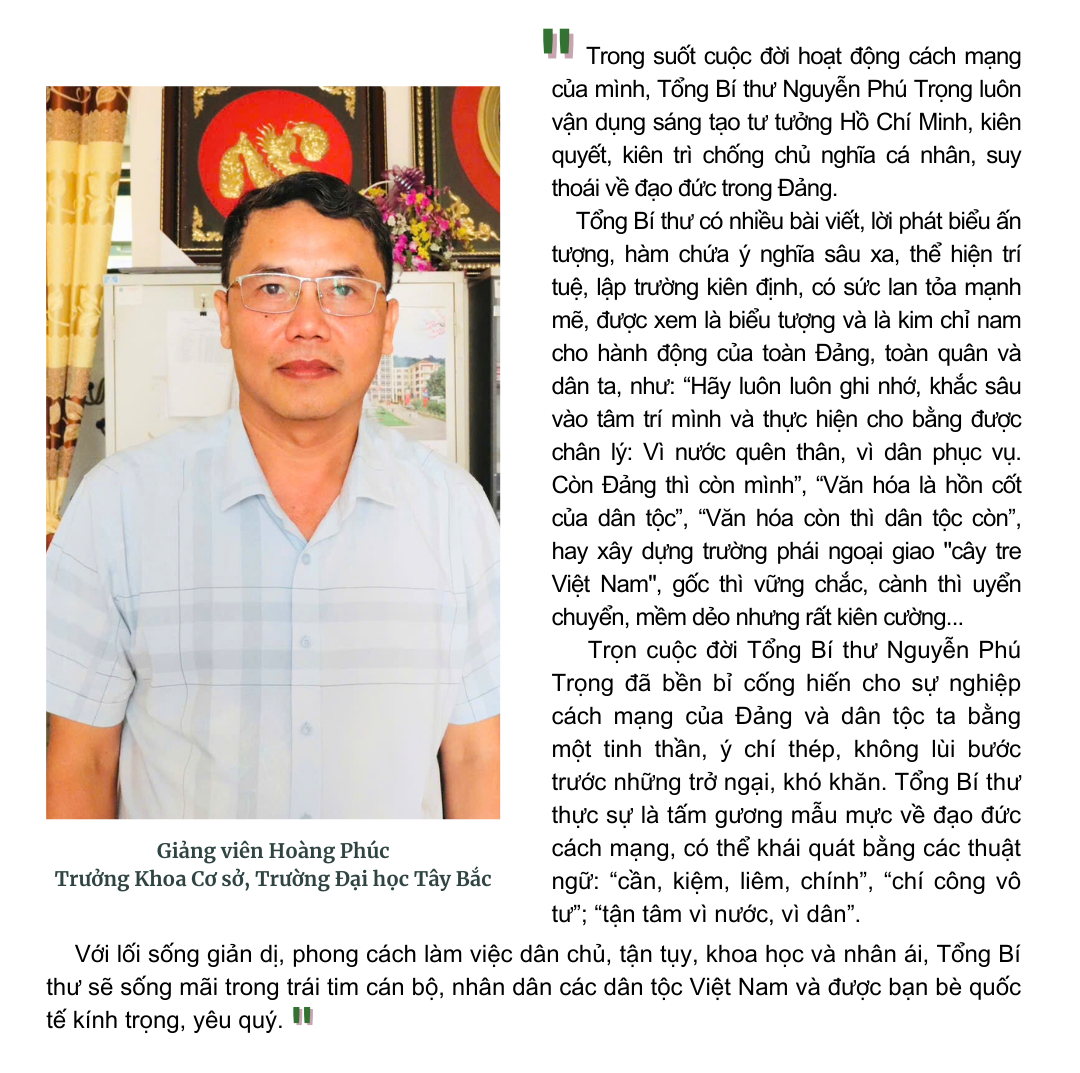 Cả cuộc đời hết lòng, hết sức phụng sự Tổ quốc, phục vụ nhân dân, là hình mẫu một chiến sĩ cộng sản chân chính, kiên trung, Tổng Bí thư Nguyễn Phú Trọng là tấm gương sáng về học tập và làm theo tư tưởng, đạo đức, phong cách Hồ Chí Minh.