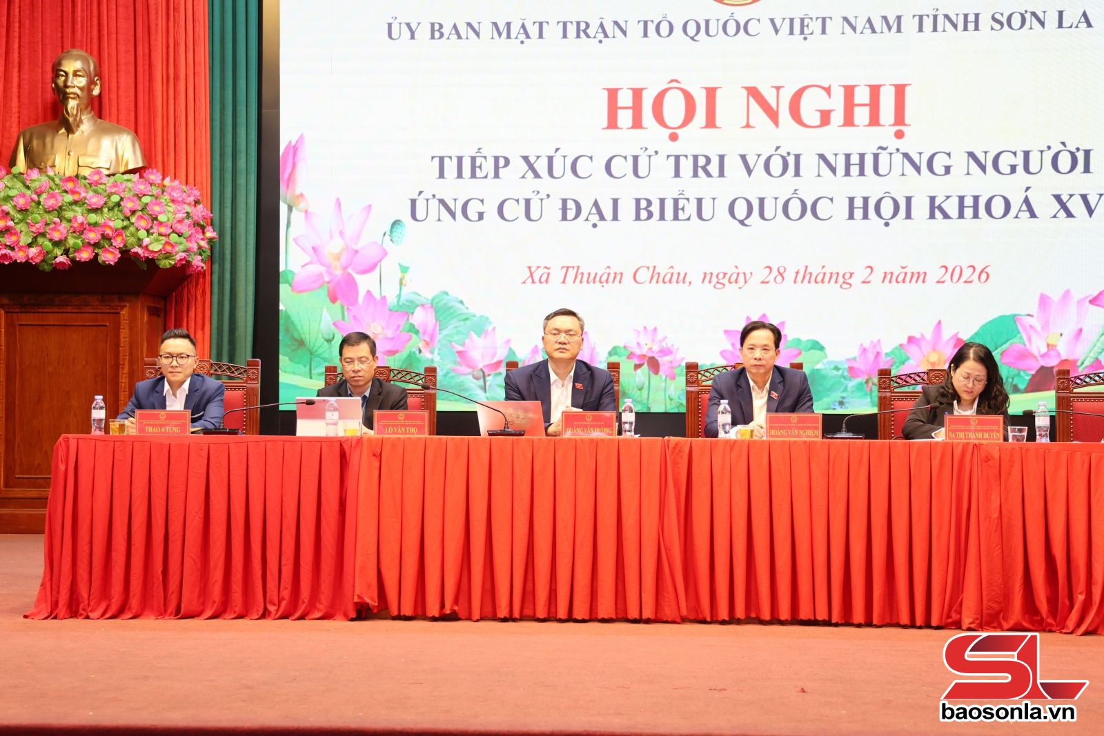 Ngày 28/2, tại xã Thuận Châu, Ban Thường trực Ủy ban MTTQ Việt Nam tỉnh đã tổ chức Hội nghị tiếp xúc cử tri với những người ứng cử đại biểu Quốc hội khóa XVI, nhiệm kỳ 2026 - 2031 thuộc Đơn vị bầu cử số 1.