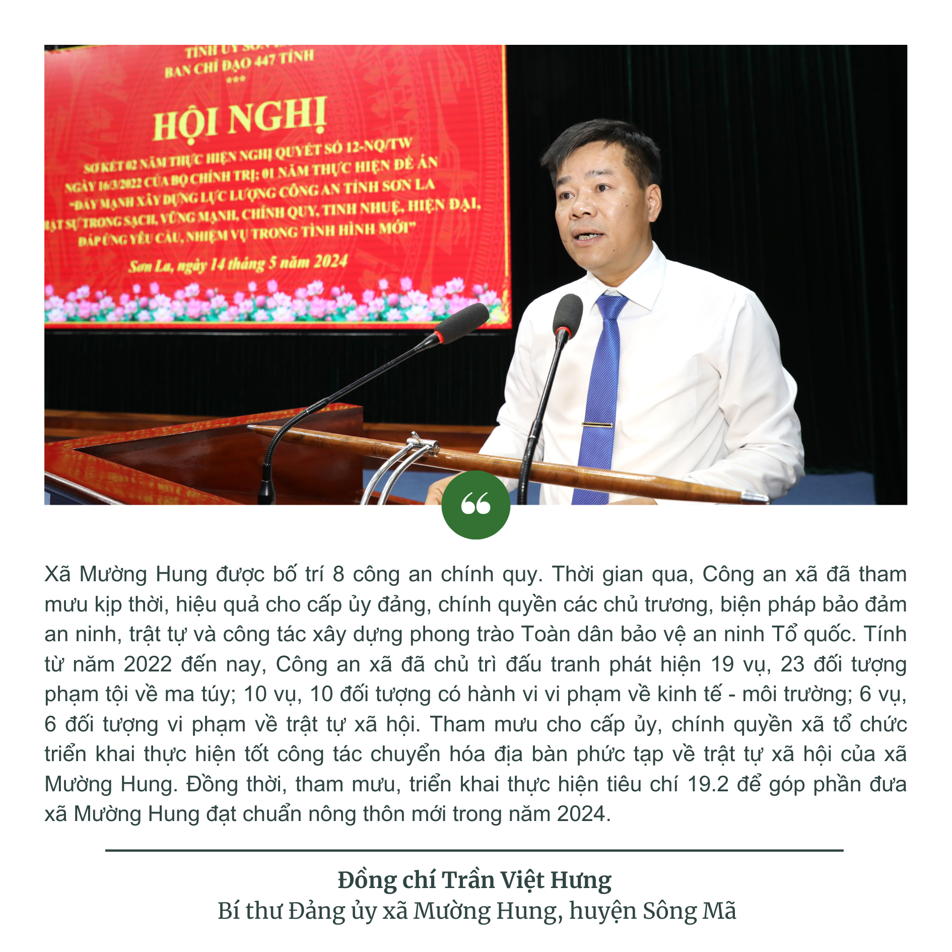 Phát biểu tại hội nghị, Thượng tướng Trần Quốc Tỏ, Thứ trưởng Bộ Công an, nhấn mạnh: Đảng ủy Công an Trung ương, Bộ Công an đánh giá rất cao Tỉnh ủy Sơn La, Ban Chỉ đạo 447 Sơn La đã chủ động chỉ đạo Hội nghị sơ kết 2 năm thực hiện Nghị quyết số 12 của Bộ Chính trị và 1 năm thực hiện Đề án, thể hiện quyết tâm chính trị của cấp ủy, sự điều hành quyết liệt của chính quyền. Đây là hội nghị đầu tiên trong cả nước về sơ kết 2 năm thực hiện Nghị quyết số 12 của Bộ Chính trị.