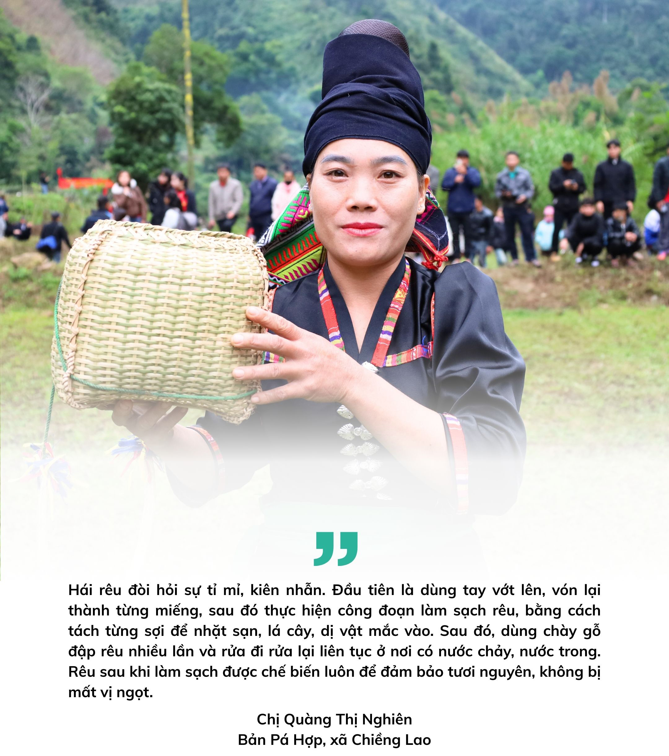 Rêu suối sau khi hái về phải trải qua công đoạn sơ chế rất tỉ mỉ. Ngay tại bờ suối hoặc trên những phiến đá phẳng, rêu được đặt lên và dùng chày gỗ đập mạnh, đều tay. Việc đập rêu kết hợp với giũ nước nhiều lần giúp loại bỏ hoàn toàn sạn, cát, chỉ giữ lại những sợi rêu xanh non, sạch sẽ nhất.
