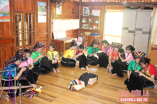 Hướng dẫn thêu khăn piêu tại CLB “Mô hình nét đẹp khăn Piêu” xã Viêng Lán, huyện Yên Châu.