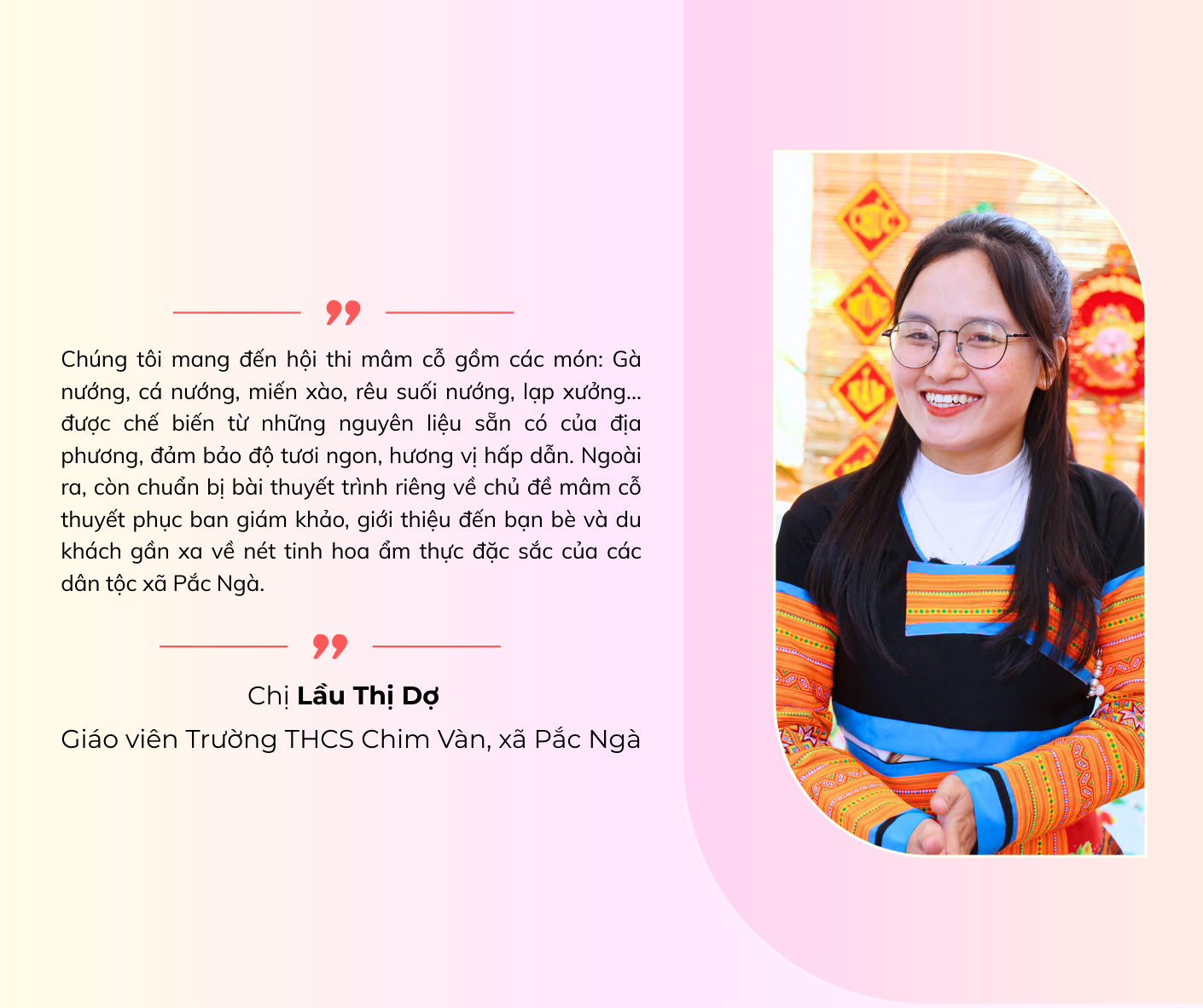 Một trong những nội dung thu hút sự chú ý nhất tại ngày hội là phần thi ẩm thực. 5 đội thi từ các bản và cụm trường học mang đến những mâm cỗ với các món đặc sản của đồng bào như pa pỉnh tộp, thịt gác bếp, xôi ngũ sắc và các loại nộm rau rừng… Các món ăn được trình bày đẹp mắt, thể hiện sự tinh tế trong đời sống ẩm thực của người dân Pắc Ngà.