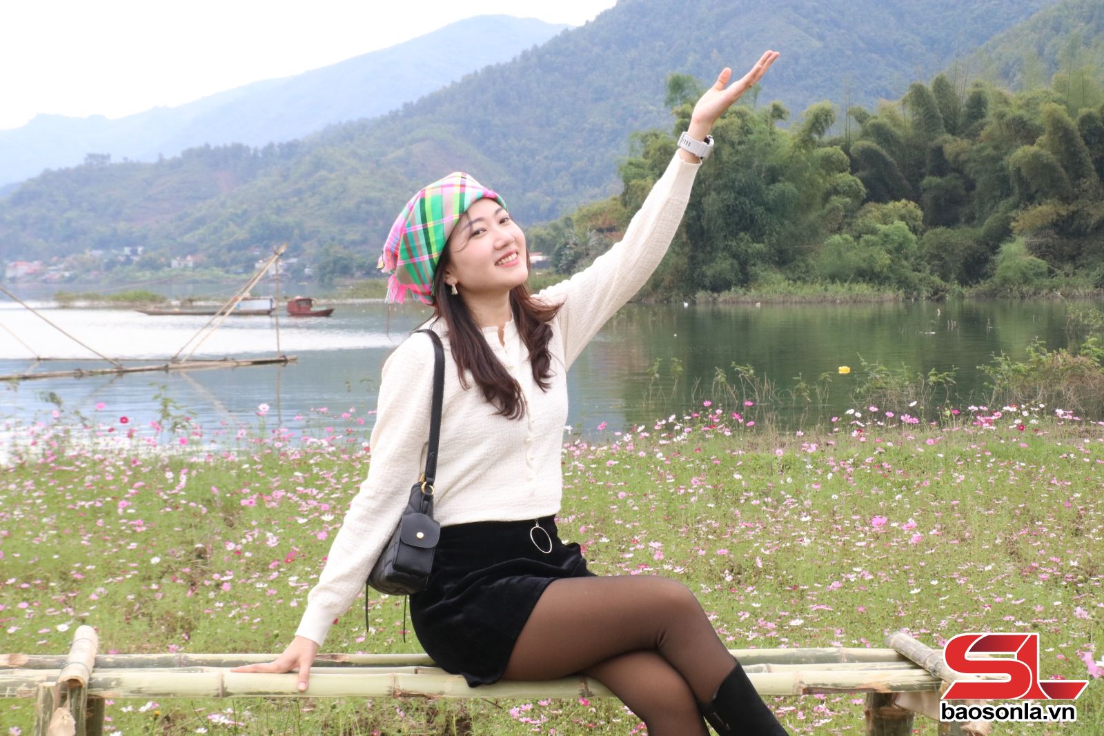 Du khách checkin cùng chiếc khăn thổ cẩm của dân tộc Mường.