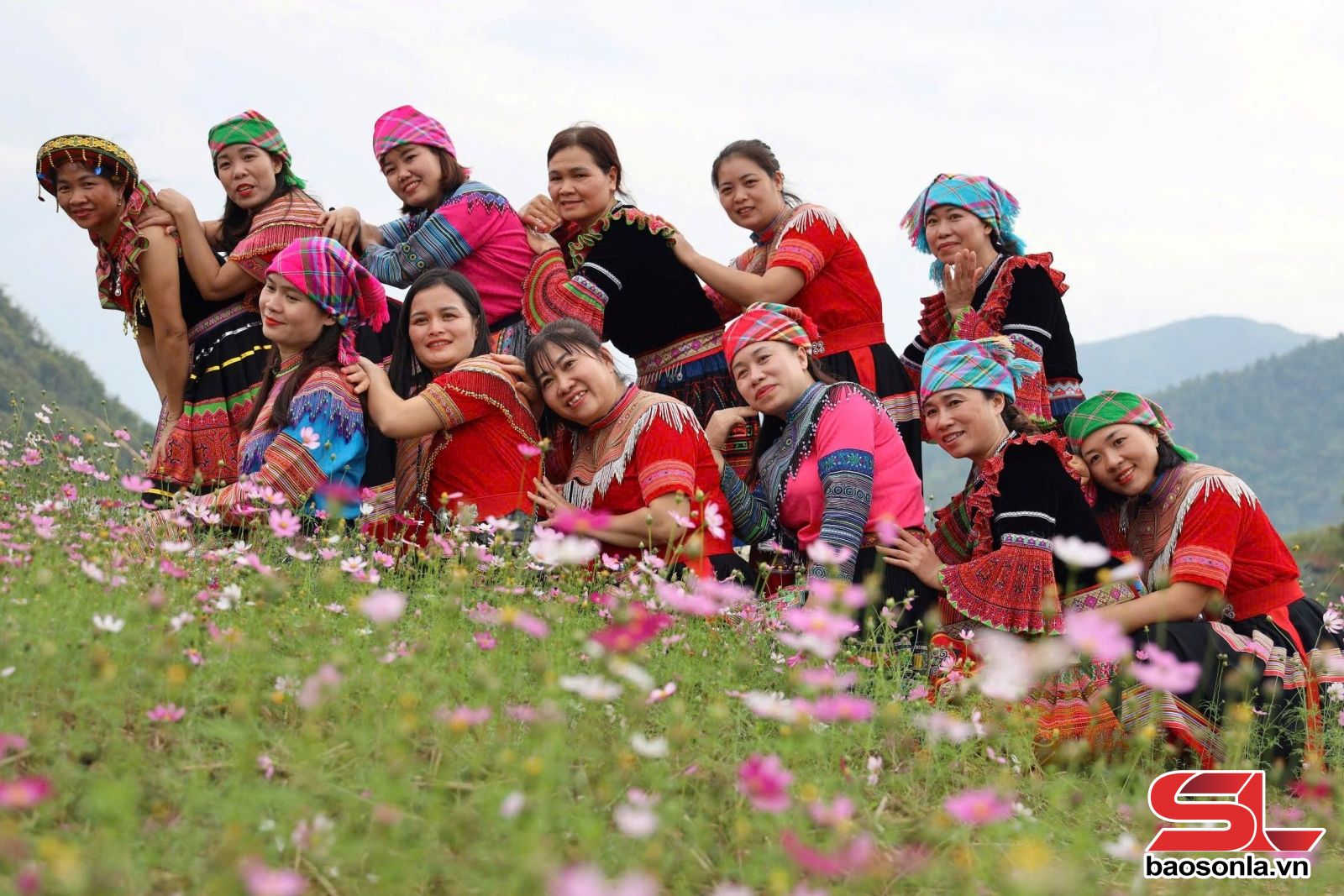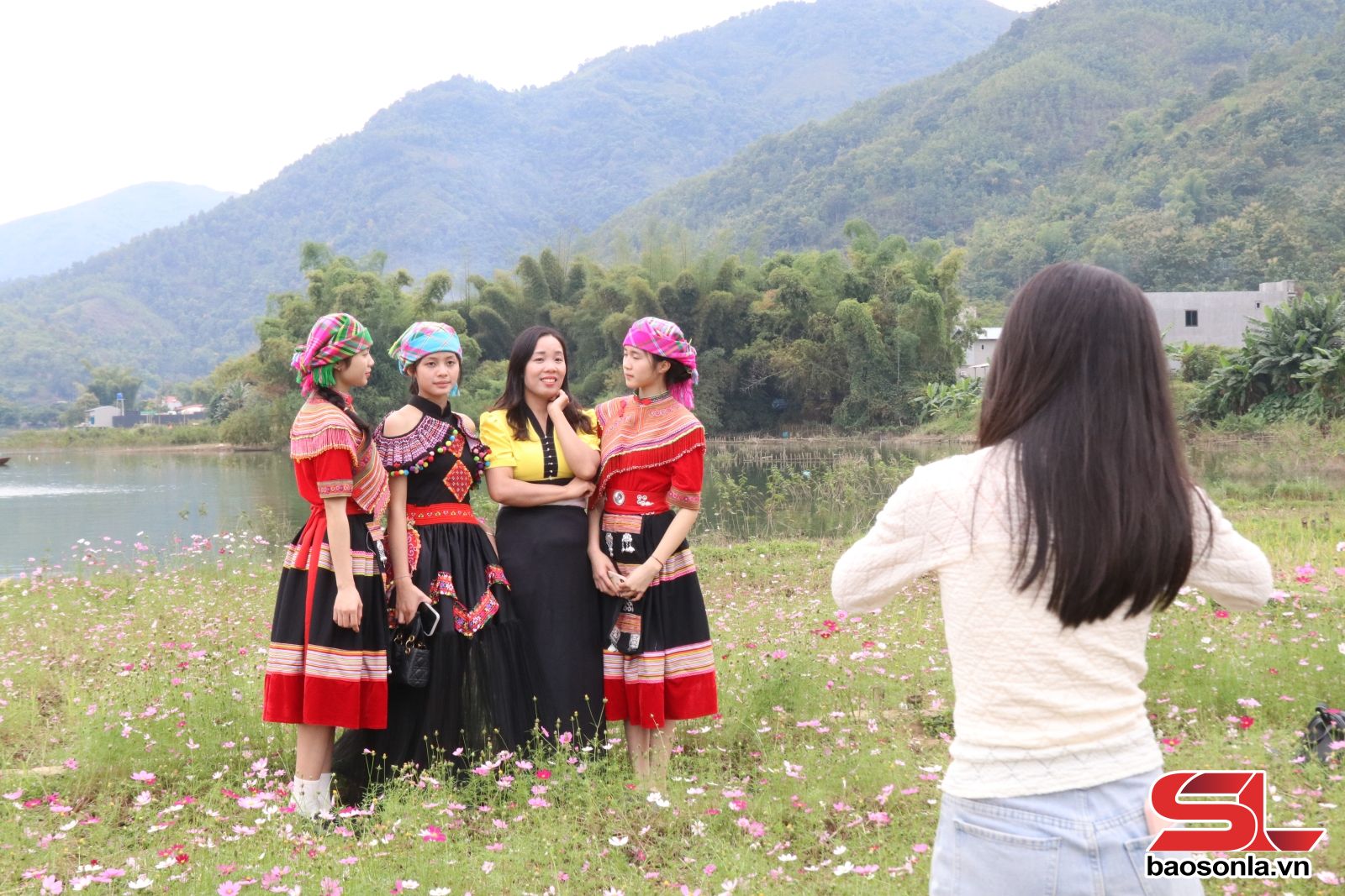 Nhân dân mặc trang phục dân tộc Mông, Thái chụp ảnh tại vườn hoa bản Cải, xã Tường Hạ.