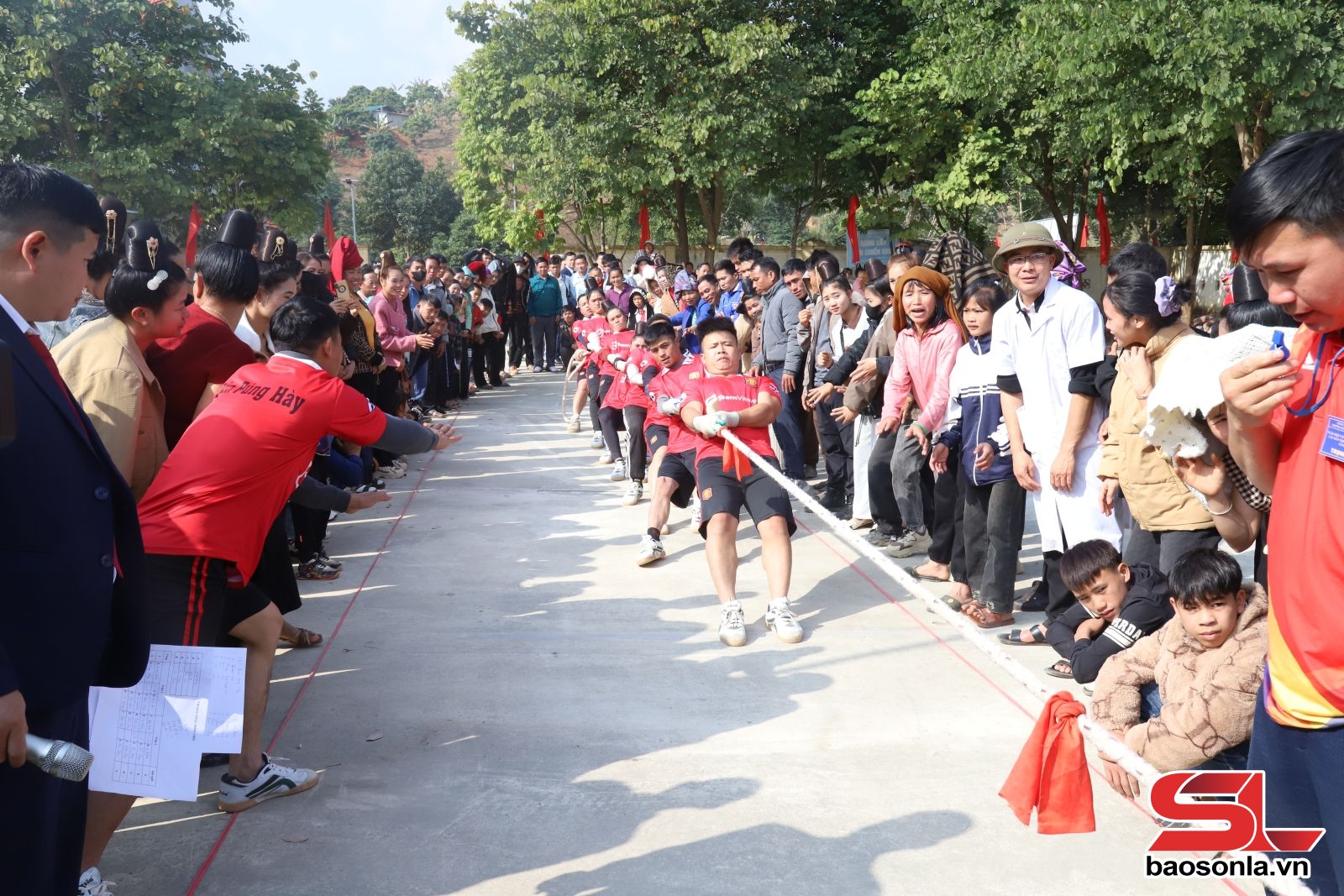 Có gần 1.000 vận động viên đến từ 27 bản trên địa bàn xã tham gia tranh tài ở các nội dung kéo co, đẩy gậy, bắn nỏ, tung còn...
