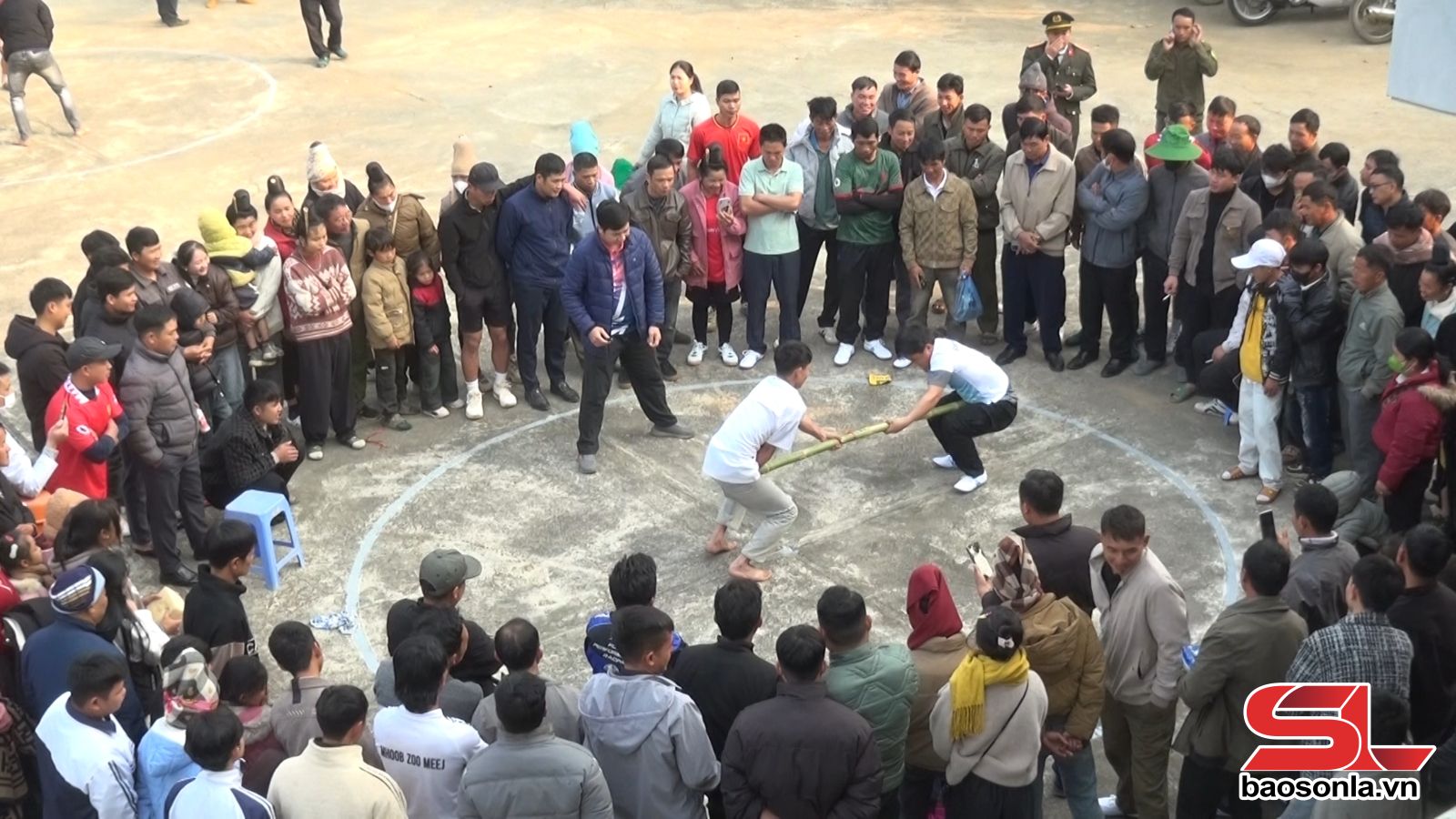 Ở môn đẩy gậy, các vận động viên nam hạng cân 60-65 kg và nữ hạng cân 45-50 kg đã tranh tài quyết liệt. Trò chơi đòi hỏi người tham gia phải có sức khỏe tốt, bền bỉ. Bên nào chân chạm vào vạch hoặc bị đẩy ra khỏi vòng tròn trước là thua cuộc.