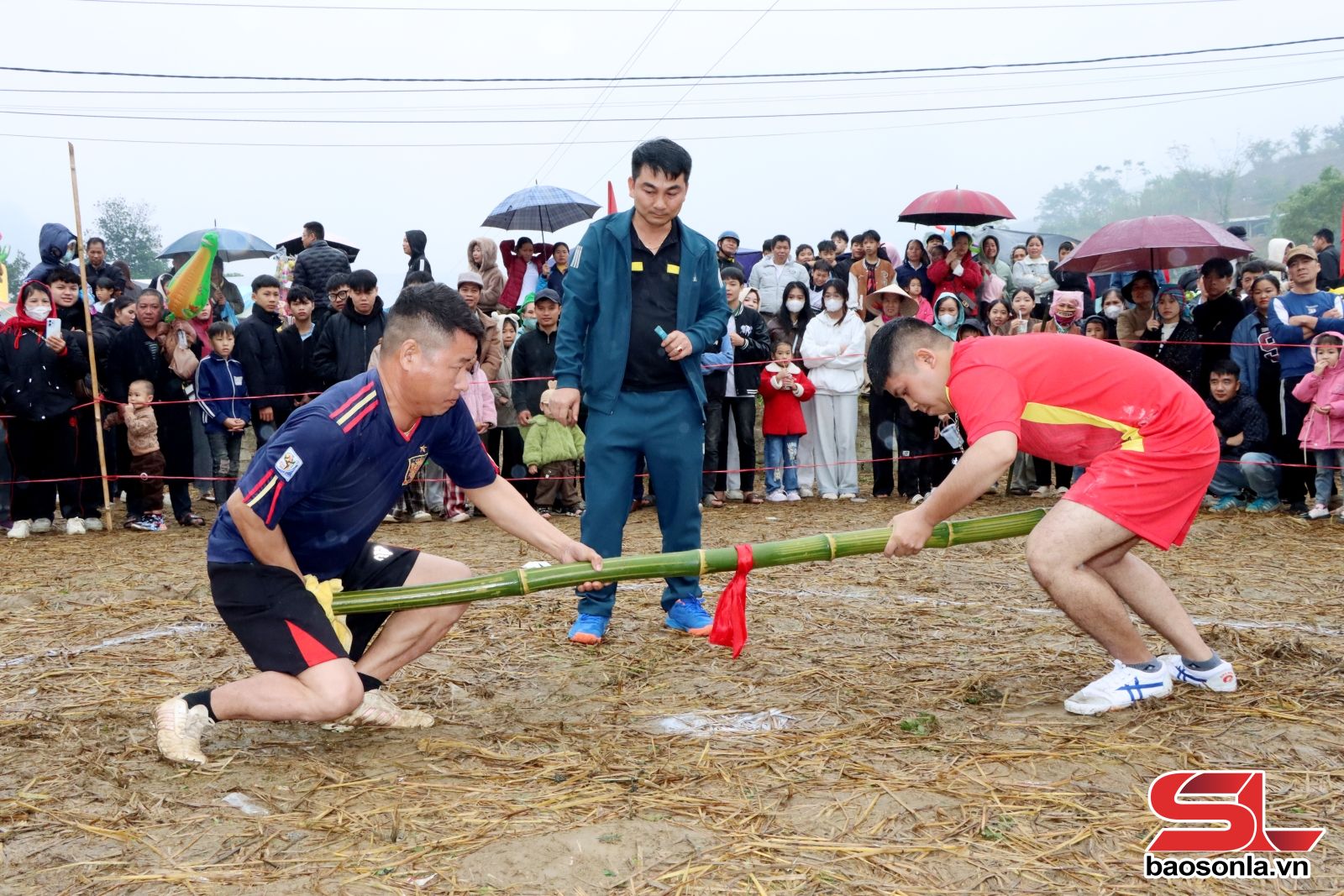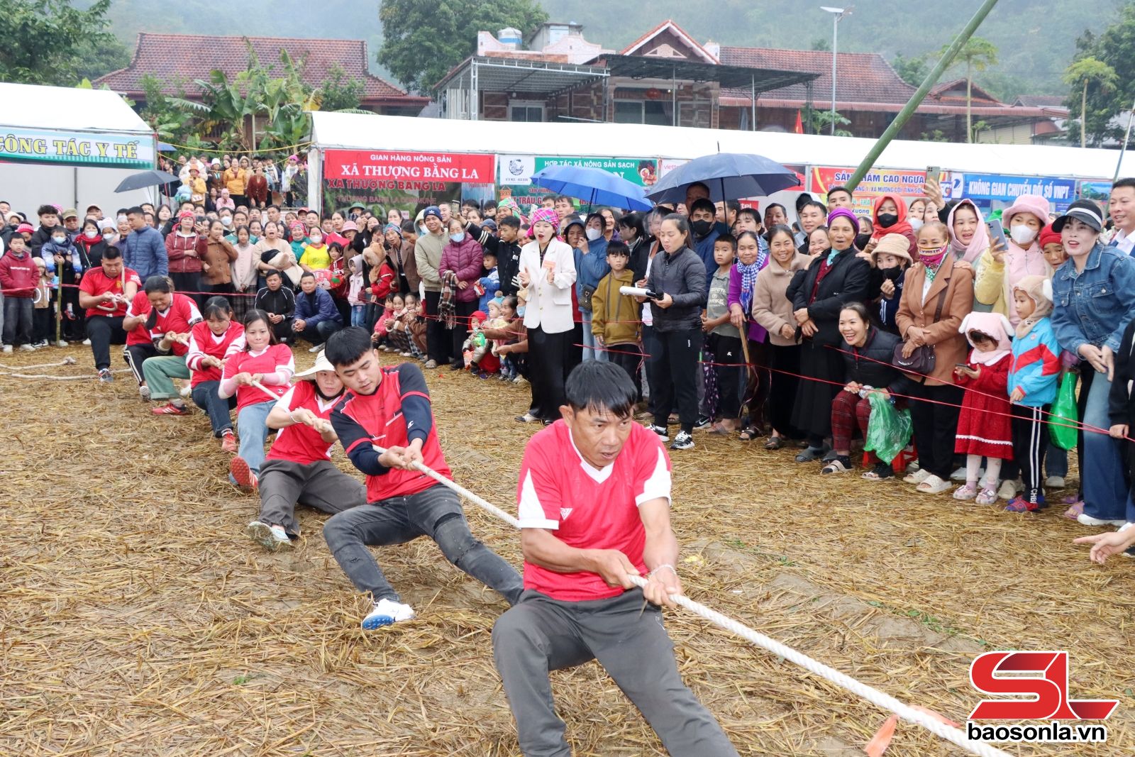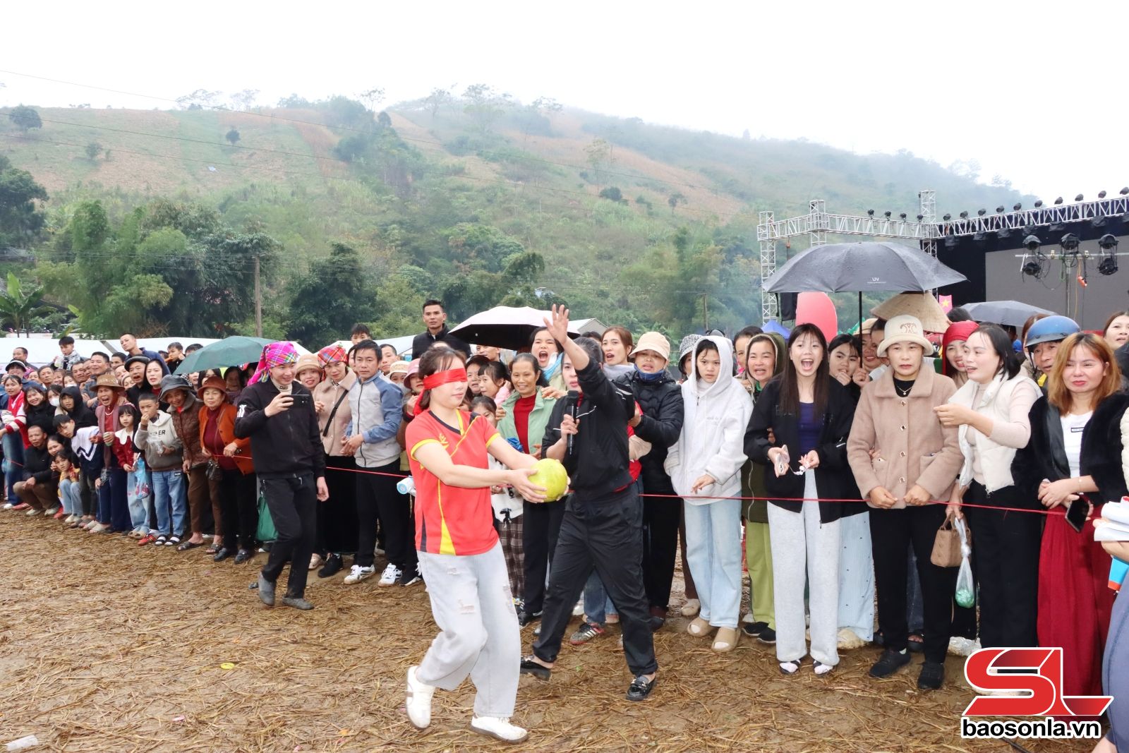 Gần 100 vận động viên đến từ các bản của xã Mường Cơi, tham gia các trò chơi: Kéo co, đẩy gậy, bịt mắt vận chuyển bưởi.