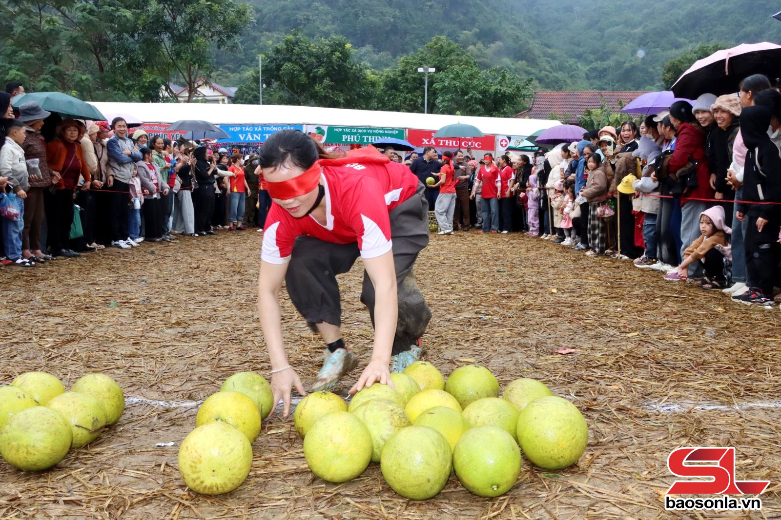 Đối với phần thi bịt mắt vận chuyển bưởi, người tham gia chơi sẽ bịt mắt và nhặt những quả bưởi mang về gùi trong thời gian quy định của Ban tổ chức. Ai nhặt được nhiều sẽ là người chiến thắng.
