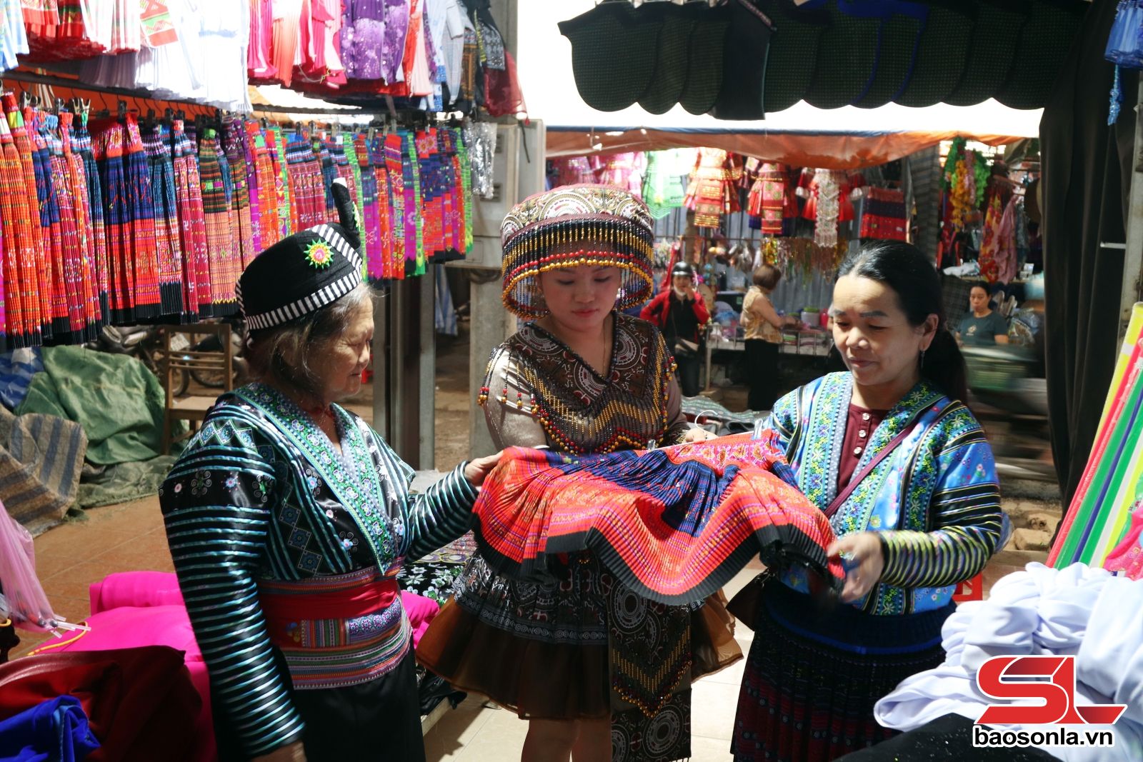 Cách đó không xa là cửa hàng bán trang phục dân tộc của gia đình chị Giàng Thị Chi, bản Đông Sàn, xã Tà Hộc. Kinh doanh tại chợ Hát Lót đã được 7 năm nay, gia đình chị Chi thuê 2 gian hàng, 1 gian lắp máy may chuyên sản xuất, còn 1 gian để bán sản phẩm hoàn thiện. Chị Chi cho biết: Ngoài cao điểm bán hàng vào đợt cuối năm, thì tôi thường xuyên livestream trên facebook, tiktok để bán hàng. Nhờ vậy, đơn hàng bán ra khá ổn định từ 200 đến 400 bộ trang phục cùng hàng trăm họa tiết, phụ kiện dân tộc Mông mỗi năm.