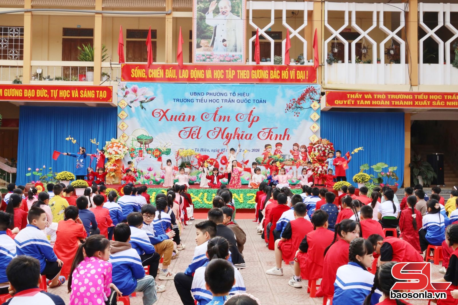 Không khí Tết cũng rộn ràng ở bậc mầm non. Tại Trường Mầm non Chiềng Đen, phường Chiềng An, hoạt động trải nghiệm Tết được tổ chức nhẹ nhàng, phù hợp với lứa tuổi, nhưng vẫn đảm bảo tính giáo dục và giàu cảm xúc. Không gian Tết được tái hiện từ trong lớp học đến ngoài sân trường qua những hình ảnh trang trí rực rỡ, những bài thơ, bài hát về mùa xuân. Trẻ được làm quen với lá dong gói bánh, quan sát mâm ngũ quả, nghe cô giáo kể về ý nghĩa phong tục ngày Tết và hướng dẫn nói những câu chúc Tết ông bà, cha mẹ.
