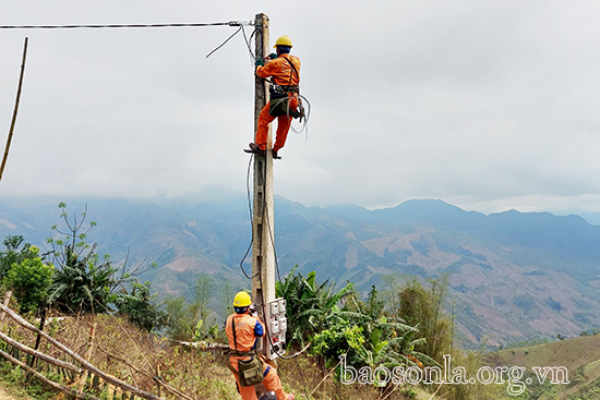 Công nhân Điện lực Phù Yên nối điện cho người dân bản Suối Hiền, xã Suối Bau (Phù Yên).