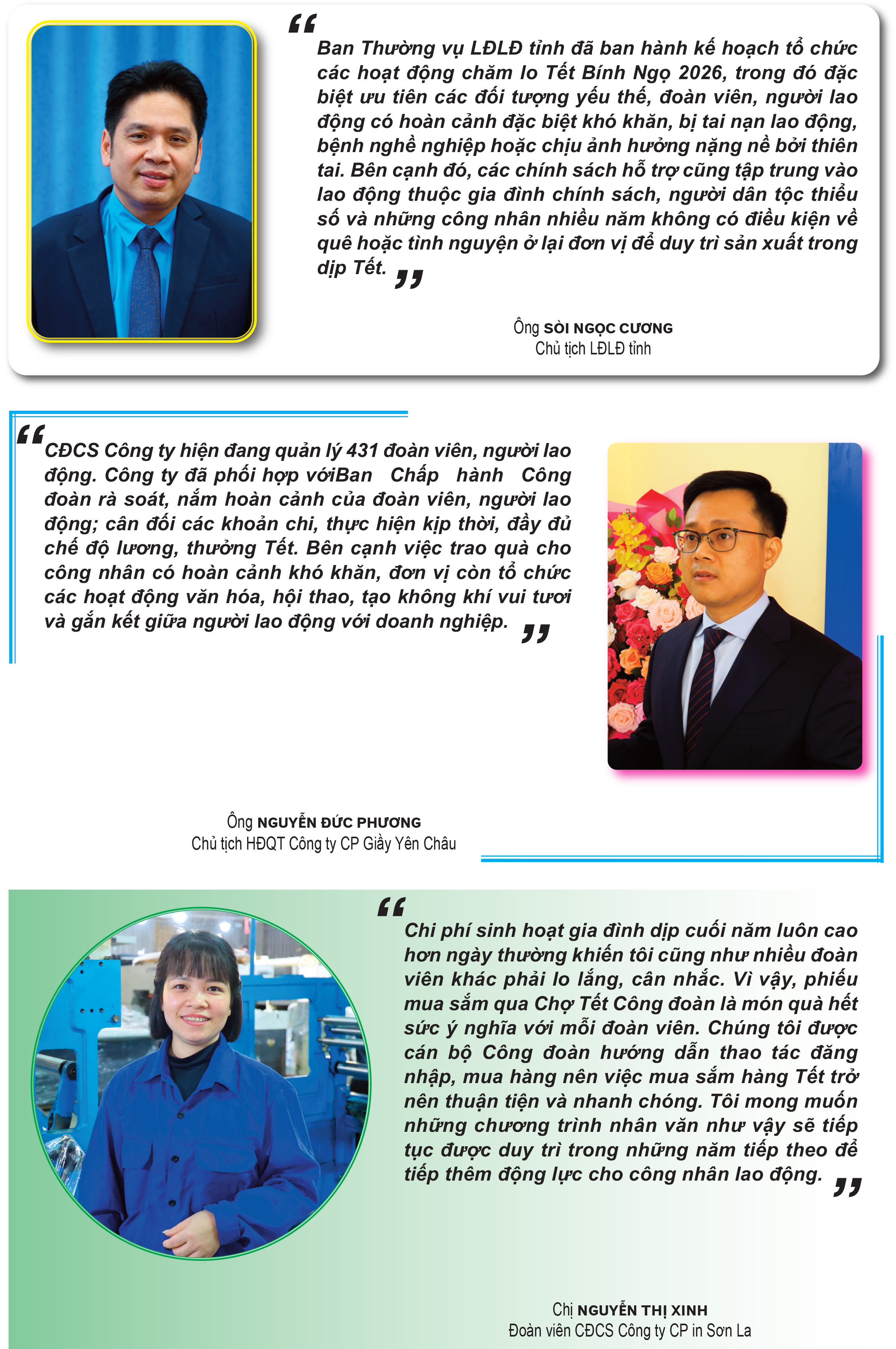 Những ngày này, Liên đoàn Lao động tỉnh đang phối hợp chuẩn bị tổ chức chương trình “Tết Sum vầy - Xuân ơn Đảng” tại Công ty cổ phần đầu tư và xây dựng Mộc Châu, dự kiến hơn 100 suất quà hỗ trợ (trị giá 1,3 triệu đồng/suất) từ Tổng Liên đoàn Lao động (LĐLĐ) Việt Nam, cùng các phần quà ý nghĩa của các đồng chí nguyên lãnh đạo Đảng, Nhà nước và LĐLĐ tỉnh sẽ được trao tận tay đoàn viên, người lao động có hoàn cảnh khó khăn. Bên cạnh đó, các hoạt động thăm, tặng quà, chúc Tết đoàn viên, người lao động thực hiện nhiệm vụ trực, sản xuất, kinh doanh tại đơn vị trong dịp Tết và mô hình “Chợ tết công đoàn - Xuân 2026” trực tuyến cũng được triển khai sớm, mang không khí Tết ấm áp đến mọi đơn vị, cơ sở.