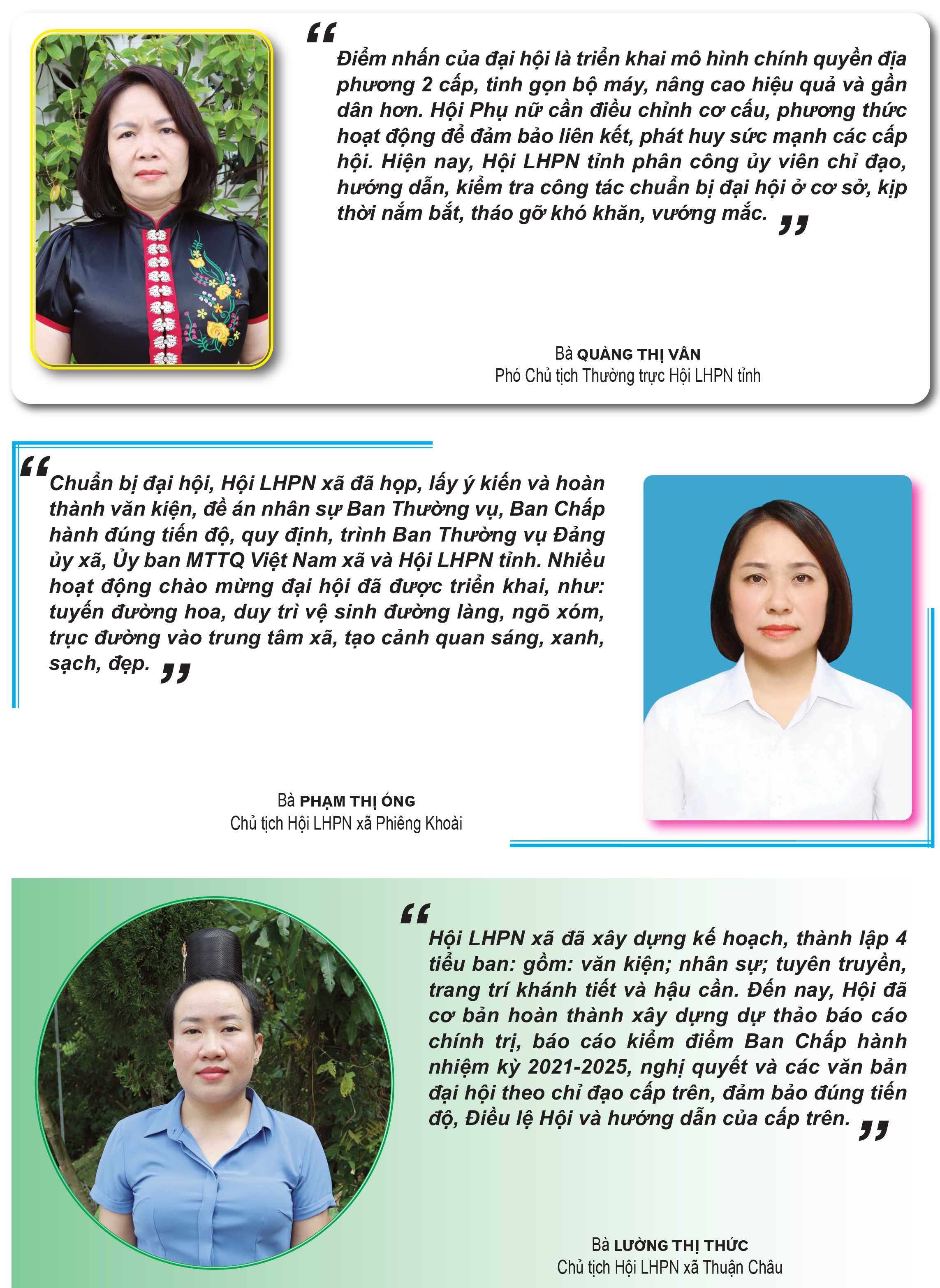 Hiện nay, các cơ sở tập trung xây dựng văn kiện, xác định phương hướng nhiệm kỳ tới với tầm nhìn dài hạn, phù hợp với quy mô, hội viên và tiềm năng của xã sau sáp nhập. Với các xã không sáp nhập, đề án nhân sự được xây dựng đúng đối tượng, đúng quy định. Khác với trước, Hội LHPN các xã, phường sẽ tổ chức đại hội sau khi Ủy ban MTTQ Việt Nam xã, phường hoàn thành đại hội. Do đó, để đảm bảo tiến độ theo Chỉ thị của Ban Thường vụ Tỉnh ủy, Hội LHPN tỉnh không chọn đại hội điểm cấp xã và chỉ đạo Đại hội đại biểu phụ nữ cấp xã, phường hoàn thành trước ngày 30/10/2025.