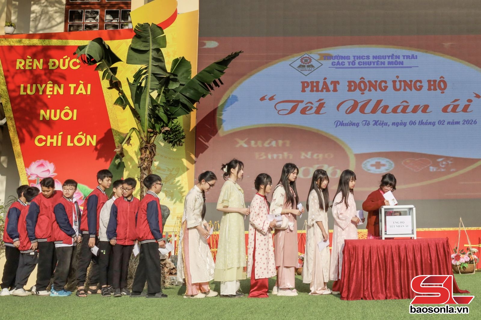Phát huy truyền thống “Lá lành đùm lá rách”, tại chương trình, nhà trường đã phát động phong trào “Tết Nhân Ái”, kêu gọi cán bộ, giáo viên và học sinh chung tay quyên góp, ủng hộ học sinh nghèo có hoàn cảnh khó khăn. Nhân dịp này, nhà trường đã trao 10 suất quà cho các em học sinh nghèo, nhằm động viên các em tiếp tục nỗ lực, vươn lên trong học tập và rèn luyện.