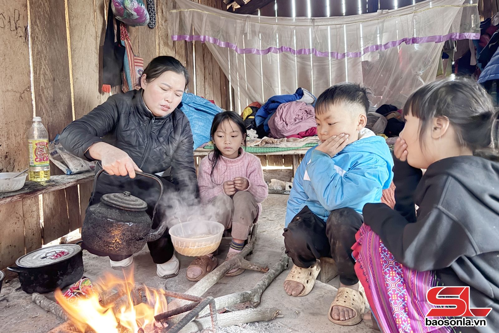 Bữa cơm ngày đầu tuần hôm nay thịnh soạn hơn hẳn ngày thường, nhờ sự tiếp tế từ cha mẹ sau ngày nghỉ. Thực đơn có thêm mấy gói mì tôm, vài con cá khô và mấy quả trứng vịt. Chỉ đơn giản thế thôi, nhưng tiếng cười giòn tan của những em nhỏ bên bát canh mỳ tôm nóng khiến căn lán tạm trở nên ấm áp.