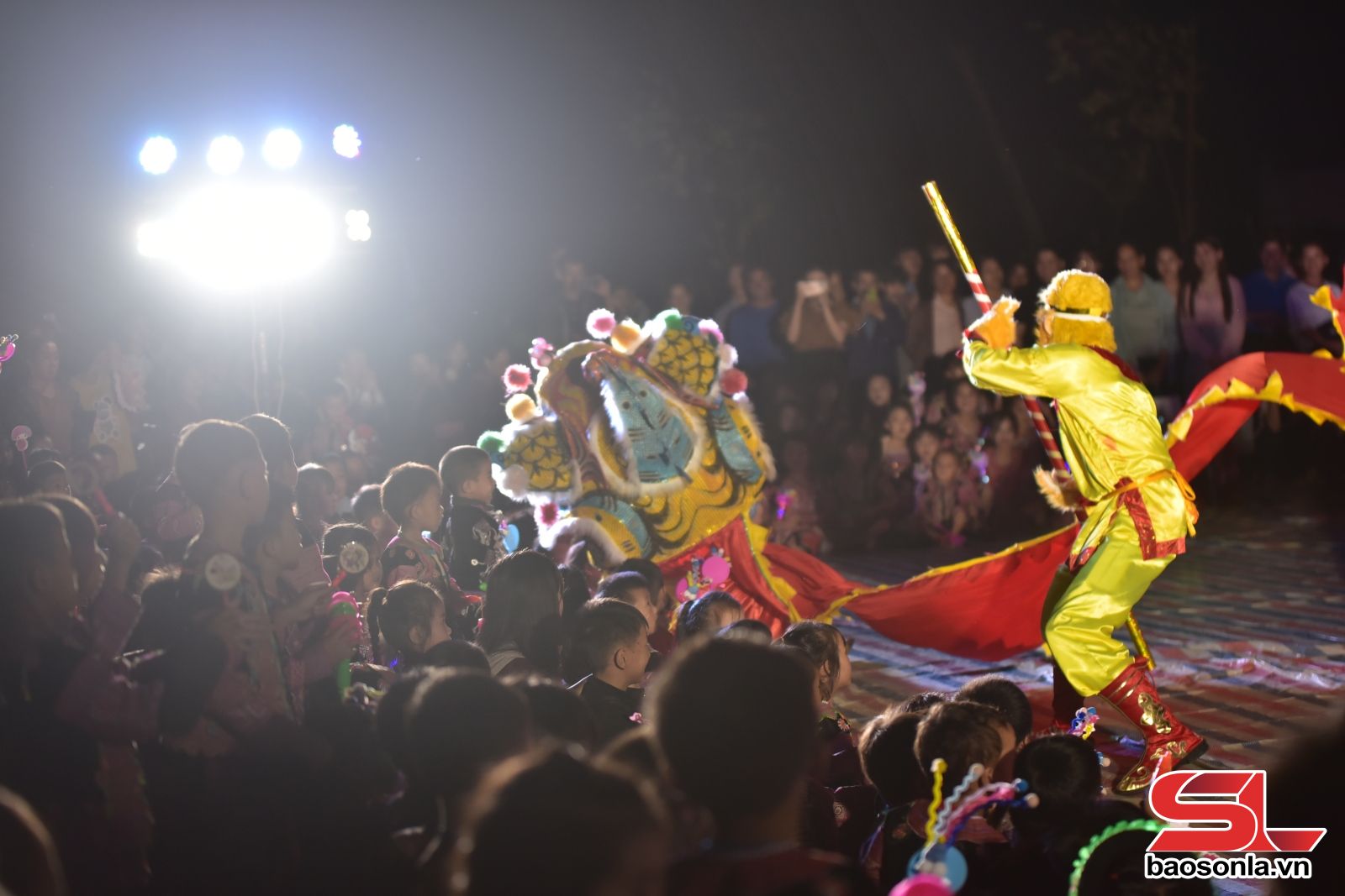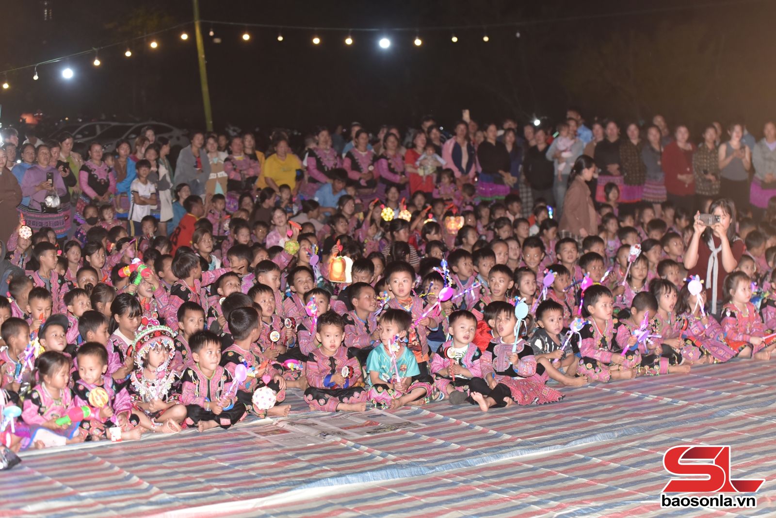 Khi ánh trăng tròn dần lên cao, tiếng trống lân vang vọng khắp bản làng. Trên sân, đội múa lân khuấy động không khí bằng những màn biểu diễn sôi động; các em nhỏ say sưa biểu diễn văn nghệ, hào hứng với những câu đố vui rồi cùng nhau phá cỗ trong niềm vui hân hoan. Tiếp đó, hàng trăm chiếc đèn được thắp sáng rực rỡ, nối nhau trên con đường bản khiến không gian bừng sáng và ấm áp.