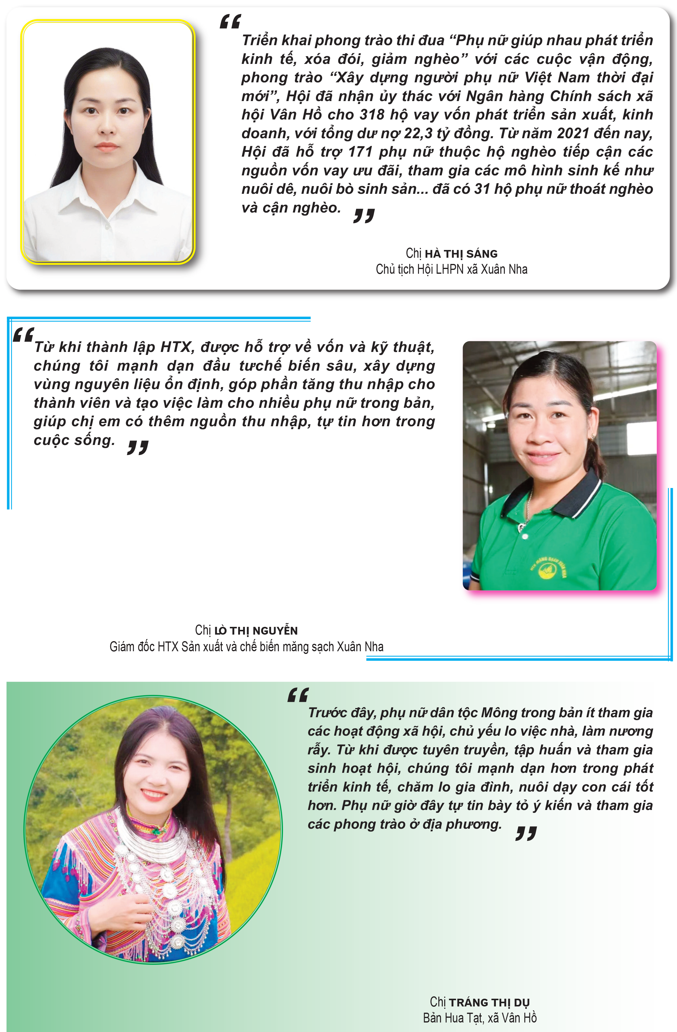 Khu vực Vân Hồ hiện có trên 10.000 hội viên phụ nữ, trong đó có trên 95% là đồng bào dân tộc thiểu số, sinh hoạt ở 115 chi hội trên địa bàn 4 xã Vân Hồ, Tô Múa, Song Khủa, Xuân Nha. Hưởng ứng các phong trào thi đua, Hội LHPN các địa phương đã đẩy mạnh tuyên truyền, vận động hội viên tích cực chuyển đổi cơ cấu cây trồng, vật nuôi, đưa các loại giống cây, con có năng suất, chất lượng cao vào sản xuất; nhận ủy thác với Phòng Giao dịch Ngân hàng Chính sách xã hội Vân Hồ cho trên 3.200 hộ hội viên vay vốn với tổng dư nợ trên 122 tỷ đồng. Đồng thời, phối hợp với các cơ quan chuyên môn tổ chức tập huấn, hướng dẫn hội viên ứng dụng khoa học - kỹ thuật và sản xuất, nâng cao năng suất, chất lượng sản phẩm.
