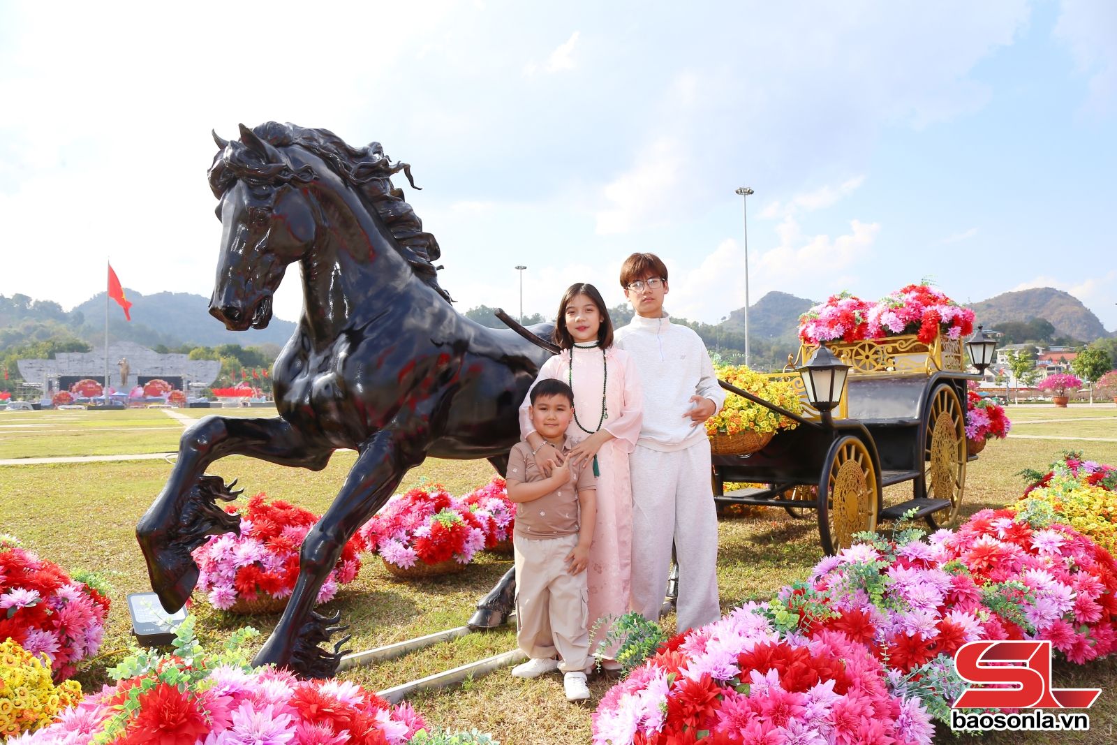 Tại Quảng trường Tây Bắc, hai mô hình linh vật ngựa kéo xe hoa được tạo hình khỏe khoắn, vươn mình trong tư thế phi nước đại, thể hiện khát vọng phát triển, bứt phá trong năm mới. Các cụm tiểu cảnh được kết hợp hài hòa giữa hoa tươi, ánh sáng tạo hình nghệ thuật... tạo nên không gian rực rỡ, ấn tượng.