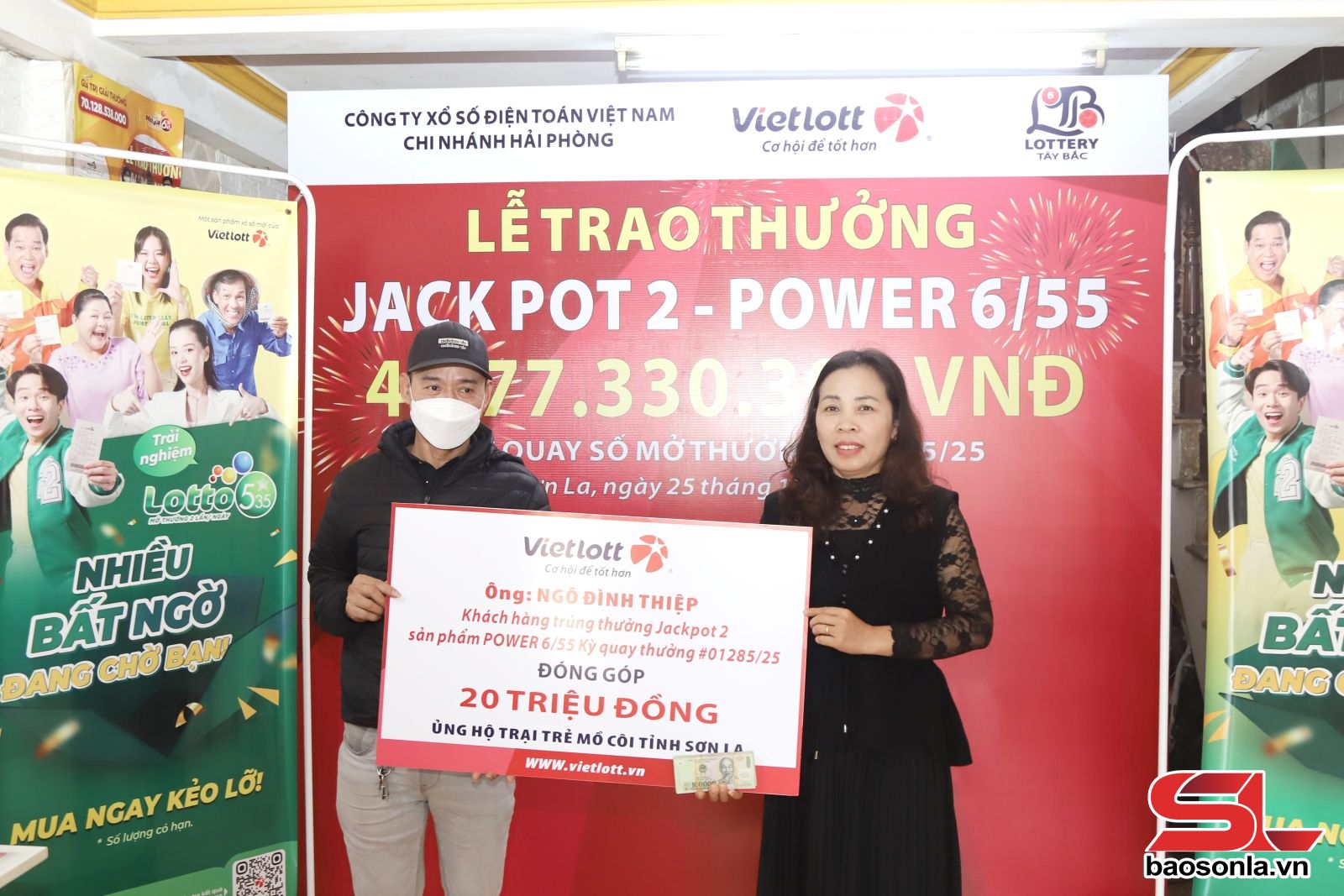 Ngày 23/12/2025, VietLott đã thực hiện quy trình quay số mở thưởng sản phẩm xổ số tự chọn Jackpot 2 - Power 6/55 kỳ quay số mở thưởng thứ 01285/25. Qua kiểm tra trên hệ thống dữ liệu kinh doanh xổ số tự chọn và hồ sơ cá nhân kèm theo xác định ông Ngô Đình Thiệp tại Sơn La đã trúng giải Jackpot 2 - Power 6/55 với giá trị trúng thưởng hơn 4,1 tỷ đồng. Điểm bán hàng phát hành vé trúng thưởng nằm ở tổ 1, phường Chiềng Sinh, tỉnh Sơn La.