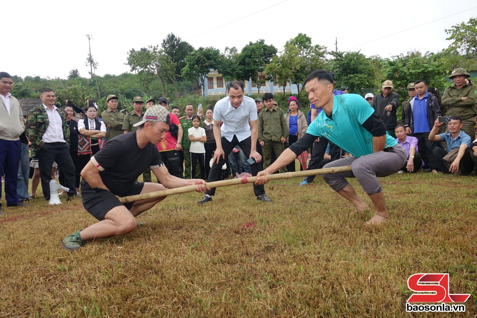 Các vận động viên tham gia thi đấu môn đẩy gậy.