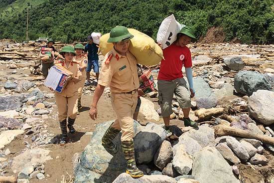 Cán bộ, chiến sĩ Phòng CSGT Công an tỉnh vận chuyển đồ hỗ trợ người dân bị thiệt hại do mưa lũ tại huyện Mường La.