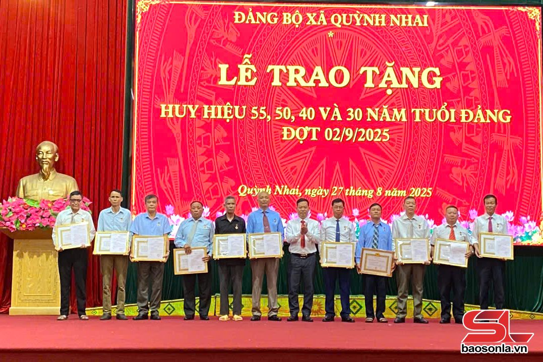 Đợt 2/9, Đảng bộ xã Quỳnh Nhai có 23 đảng viên vinh dự được trao tặng và truy tặng Huy hiệu từ 30 năm đến 55 năm tuổi Đảng. Trong đó, có 2 đảng viên được nhận Huy hiệu 55 năm tuổi Đảng; 1 đảng viên nhận Huy hiệu 50 năm tuổi Đảng; 4 đảng viên được nhận Huy hiệu 40 năm tuổi Đảng và 16 đảng viên được nhận Huy hiệu 30 năm tuổi Đảng.